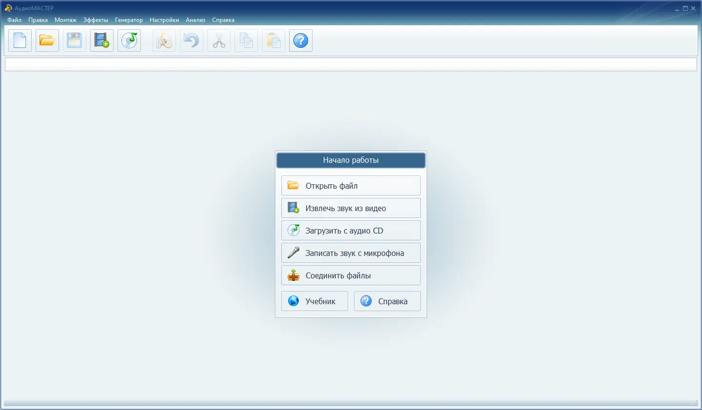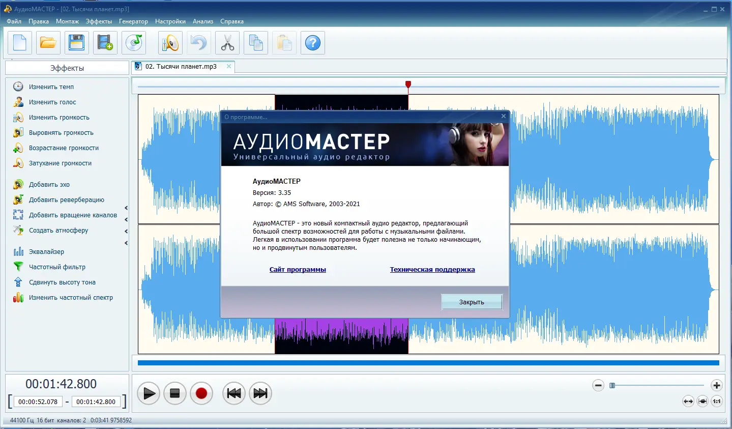 АудиоМАСТЕР — многофункциональный аудиоредактор для записи, обработки и конвертации звука, разработанный компанией AMS Software. Программа подходит как для новичков, так и для пользователей с опытом, позволяя легко редактировать аудиофайлы, накладывать эффекты, извлекать звук из видео и сохранять записи в популярных форматах. Интерфейс интуитивно понятен, а функционал охватывает основные задачи, связанные с домашней обработкой аудио.