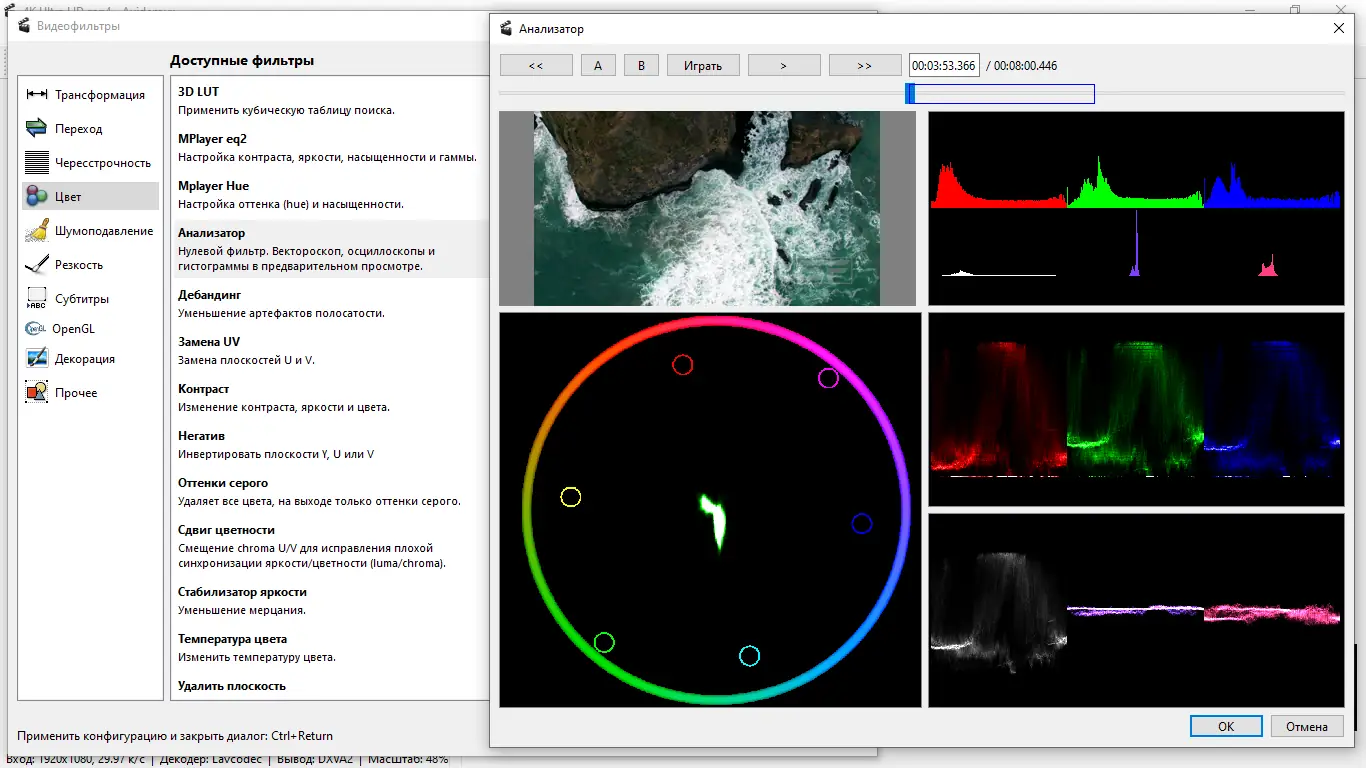- Наличие встроенных видео- и аудиофильторов: деинтерлейсинг, ресайзинг, шумоподавление, коррекция цвета.