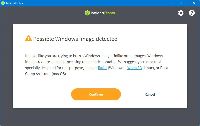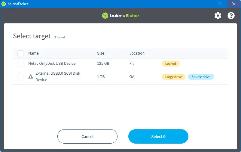 Etcher гарантирует, что вы не перезапишете системный диск, автоматически фильтруя внутренние жёсткие диски из списка доступных устройств.