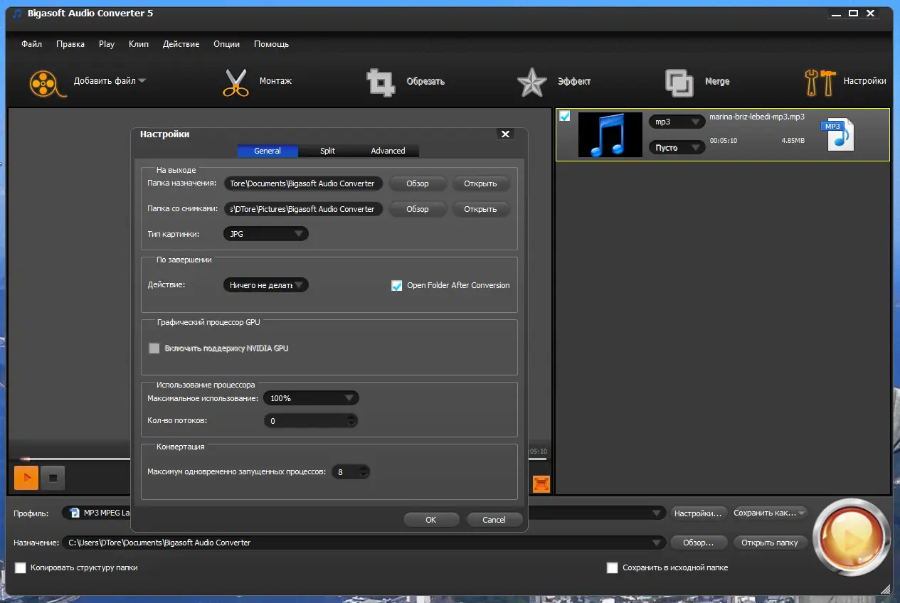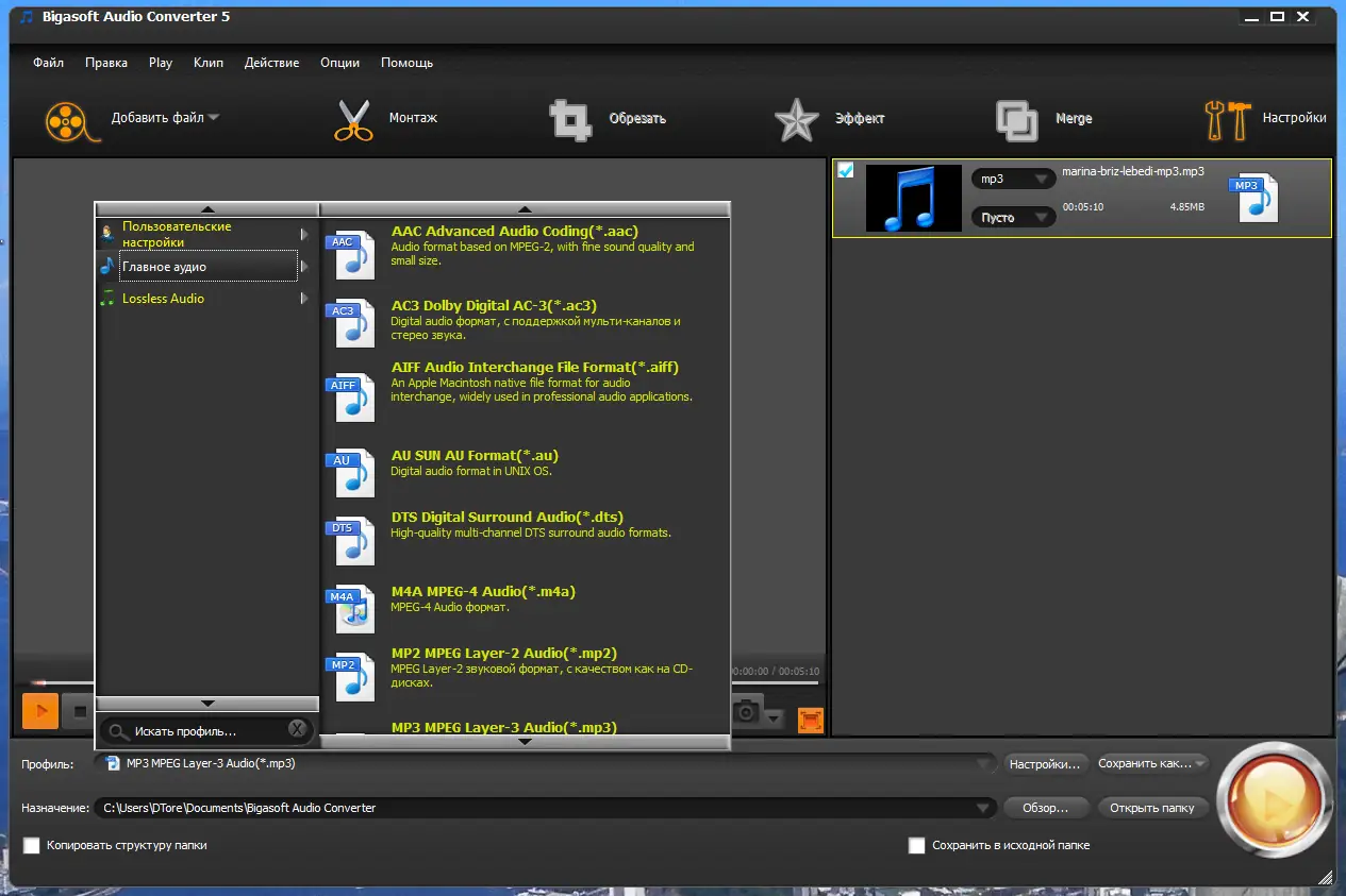 Bigasoft Audio Converter — это удобное приложение для преобразования аудиофайлов в различные форматы с поддержкой пакетной обработки и извлечения звука из видео. Программа работает с популярными кодеками и сохраняет высокое качество звучания. Подходит для пользователей, которым требуется быстрая конвертация без потерь.
