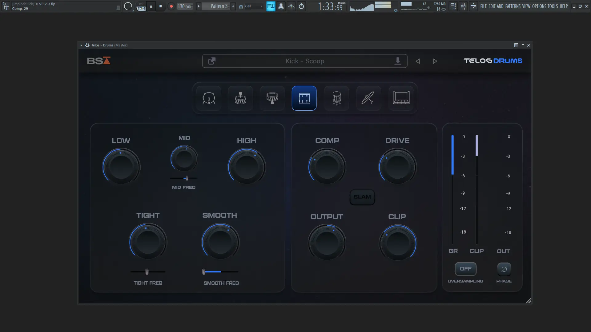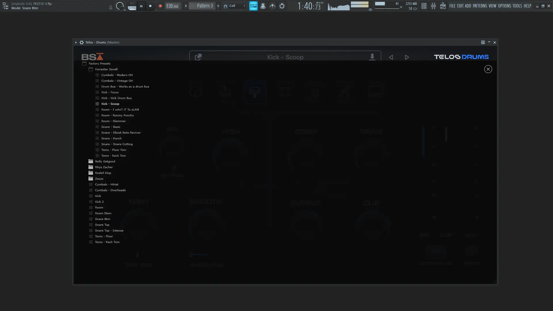 Использование плагина начинается с выбора соответствующего режима для каждого канала ударной установки. Достаточно загрузить Telos Drums на трек, выбрать нужный режим — Kick, Snare или другой — и применить предустановку. Все параметры уже сбалансированы, но при необходимости доступна тонкая настройка чувствительности, атаки, резонанса и уровня насыщения. Плагин работает в режиме реального времени, позволяя мгновенно слышать изменения.