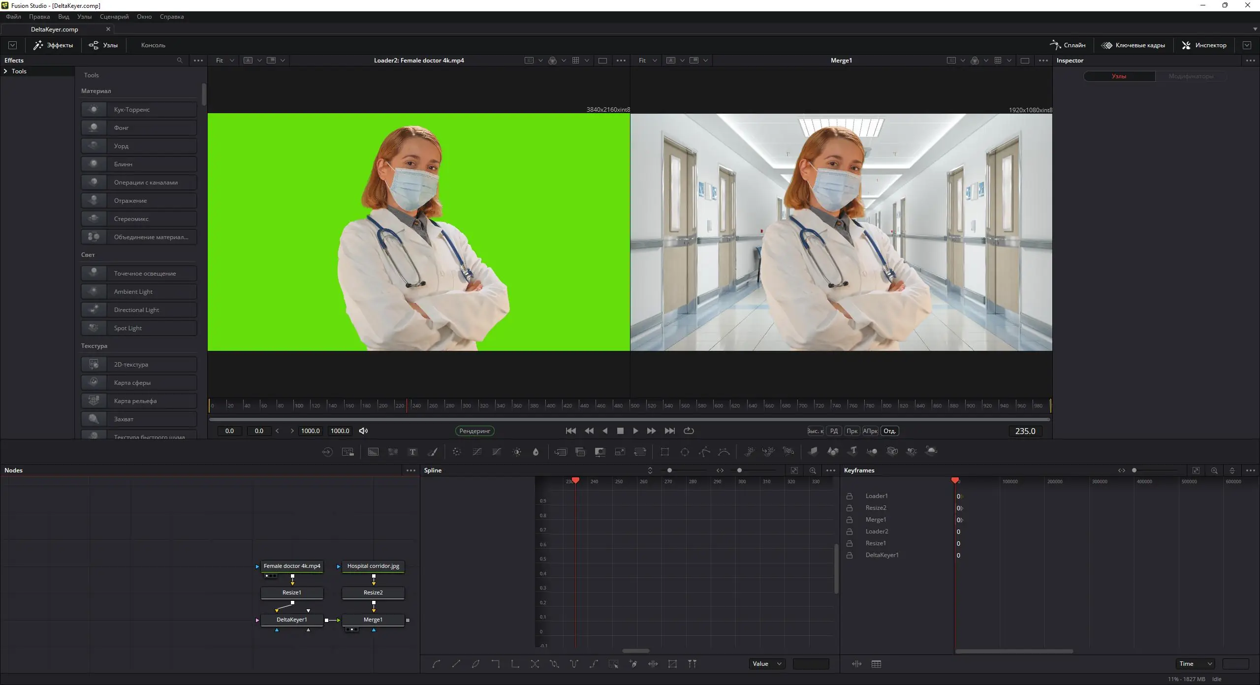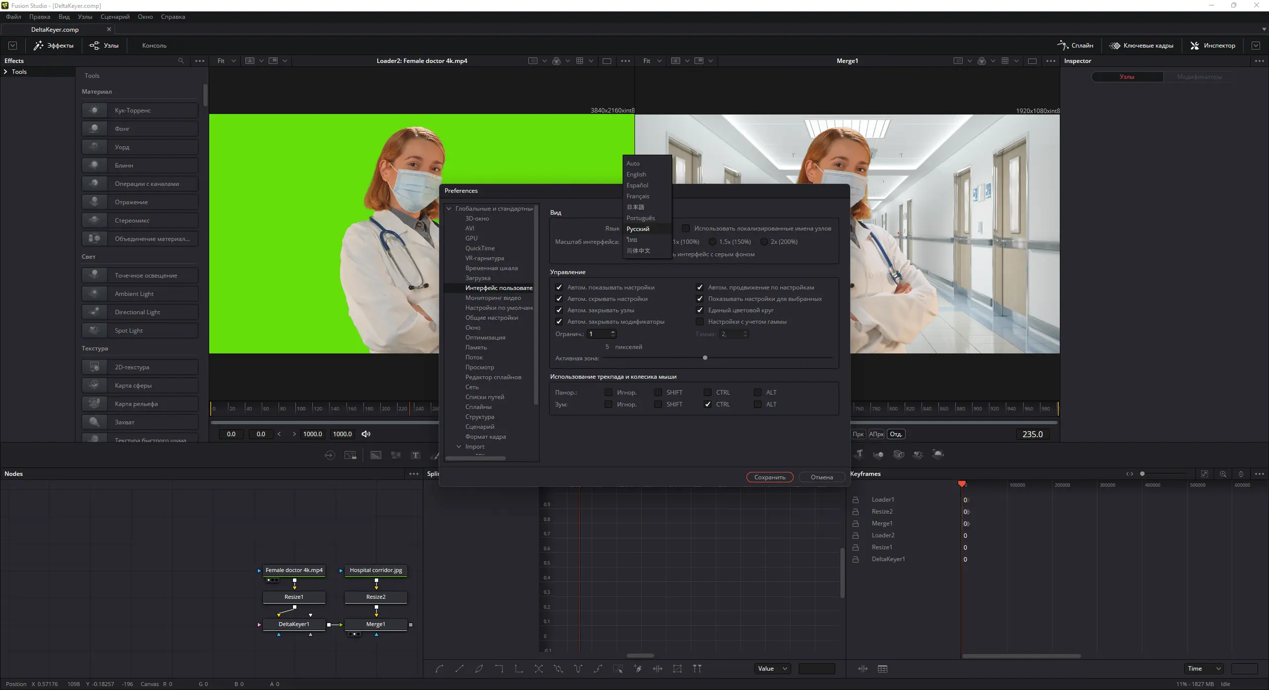 Использование Fusion начинается с построения композиции на узловой сетке, где каждый элемент — это отдельный процесс, такой как наложение маски, цветокоррекция или 3D-трансформация. Пользователь соединяет узлы, создавая логическую цепочку обработки, что позволяет легко отслеживать и редактировать каждый этап. Анимация настраивается через ключевые кадры, при этом новые модификаторы кривых позволяют автоматически корректировать тайминг при изменении длительности композиции.