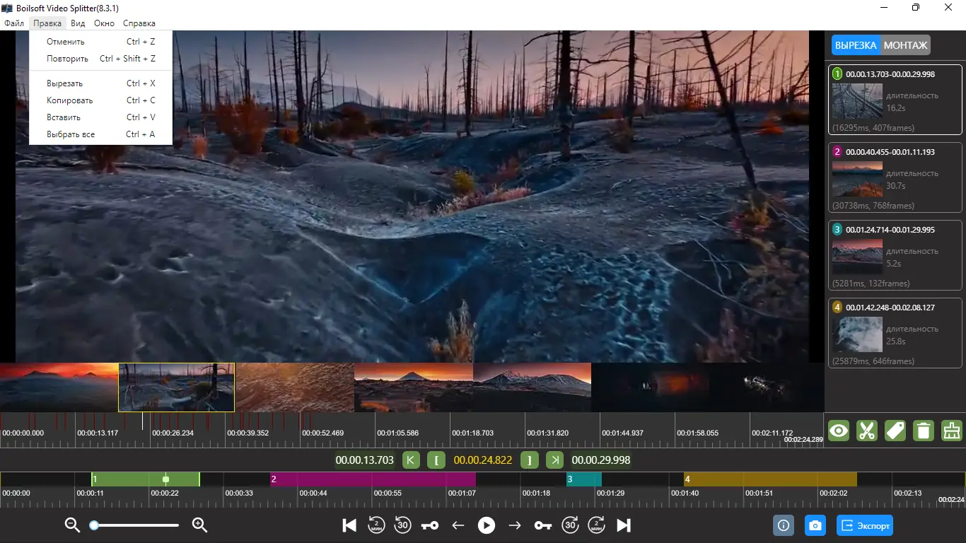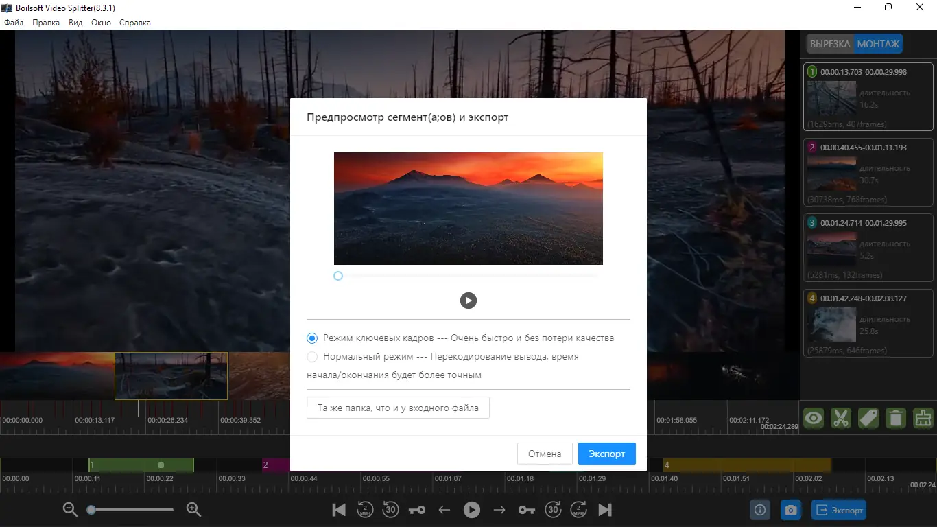 Boilsoft Video Splitter — это программа для точного и быстрого разделения видеофайлов без потери качества. Поддерживает множество форматов, включая AVI, MP4, MKV, FLV и другие, и позволяет вырезать нужные фрагменты с помощью встроенного плеера. Инструмент подходит как для новичков, так и для профессионалов, работающих с мультимедиа.