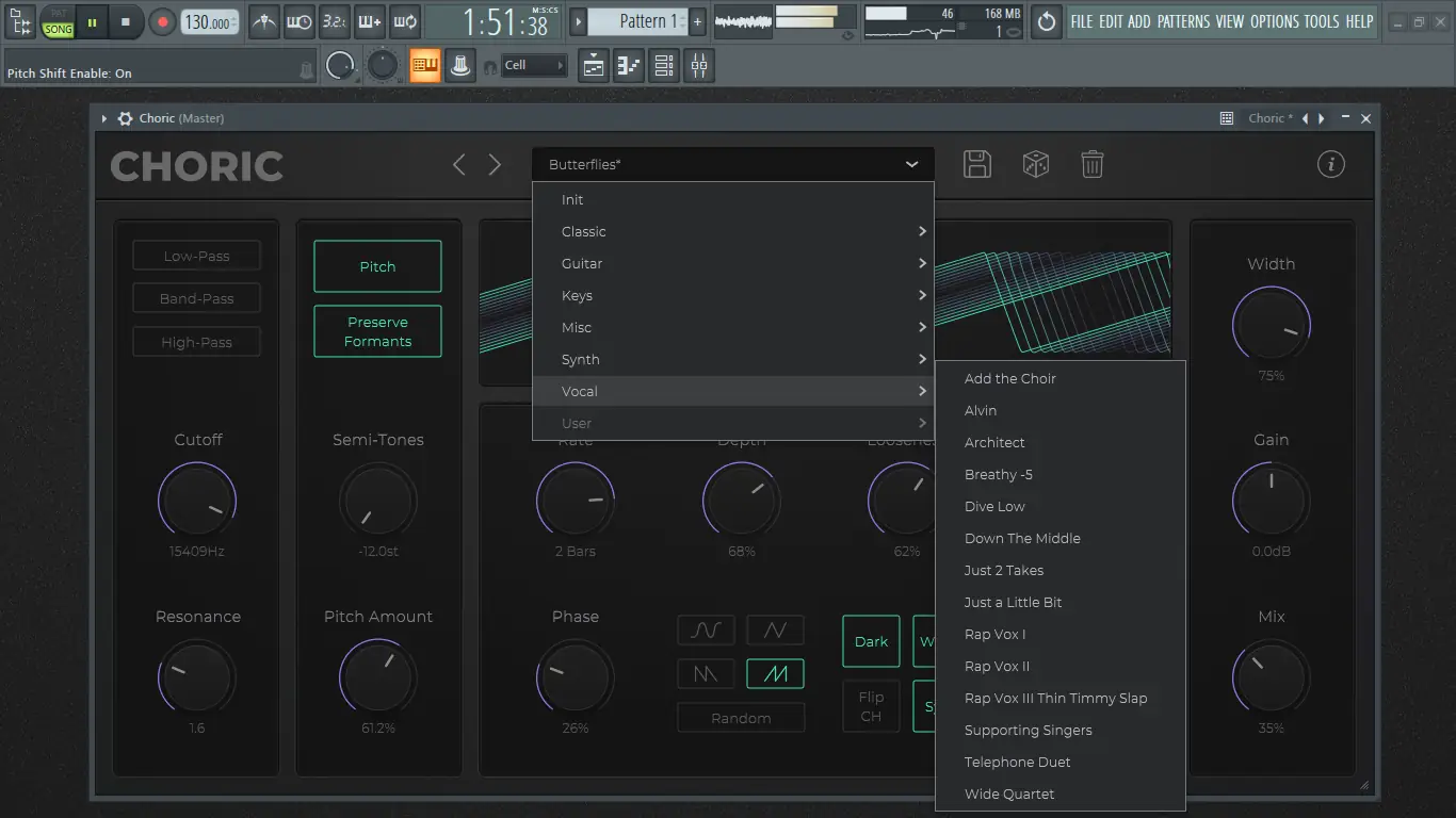 Использование плагина начинается с выбора подходящего формата модуля — стандартного или с низкой задержкой. После загрузки в DAW пользователь получает доступ к интуитивному интерфейсу, разделённому на логические секции: Filter, Pitch, Modulate, Width и Colour. Настройка начинается с определения частотного диапазона, на который будет воздействовать эффект, с помощью фильтра и параметров Cutoff и Resonance. Далее можно сдвинуть высоту тона, сохранив при этом форманты, чтобы не исказить тембр. Блок Modulate позволяет задать количество голосов, скорость модуляции, её глубину и фазовое распределение, а также регулировать временные смещения между голосами с помощью параметра Looseness. В разделе Width настраивается стереоэффект: голоса можно распределить по полю, инвертировать модуляцию в правом канале и применить расширение по средним и боковым компонентам. Наконец, режимы Warm и Dark позволяют добавить аналоговую насыщенность или приглушить высокие частоты для создания более тёмного звучания.