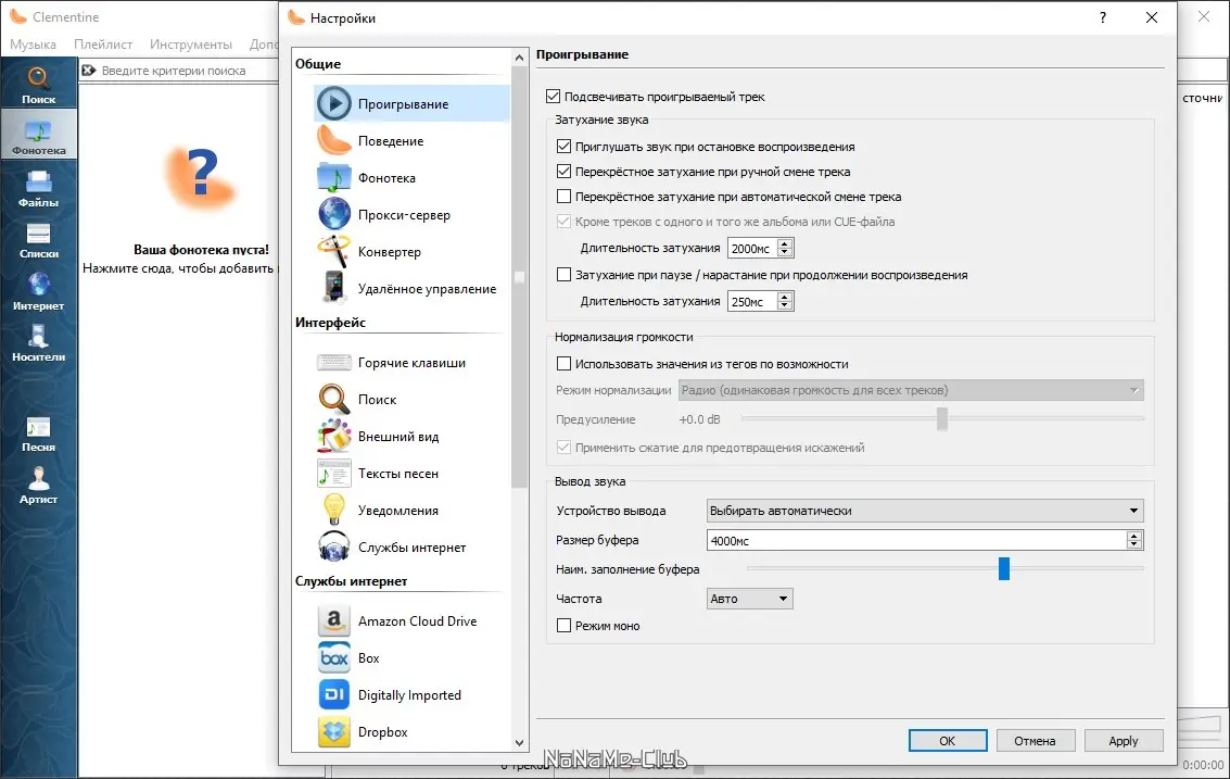 - Поддержка воспроизведения с таких сервисов, как Spotify, Soundcloud и Jamendo.