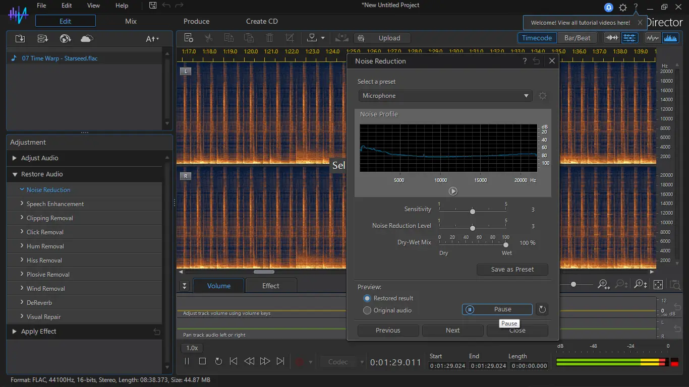 - Инструменты Restoration Adjustment Tools включают Declip, Declick, Hiss Removal и Hum Removal, что позволяет устранять искажения, щелчки, шипение и низкочастотные помехи.
