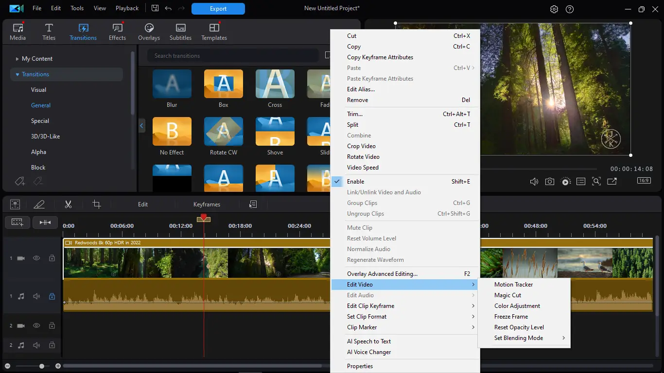 Работа с программой начинается с импорта медиафайлов, которые можно добавлять напрямую с камер, дисков или съемочных устройств. На временной шкале доступно многоуровневое редактирование с поддержкой видеодорожек, аудиодорожек и эффектов. Пользователи могут применять переходы, настраивать титры, добавлять эффекты частиц и картинку в картинке с помощью встроенных конструкторов. Режим предварительного просмотра позволяет оценить результат в высоком качестве, включая50/60 кадров в секунду. Для ускорения монтажа доступны автоматические инструменты, такие как Magic Cut и стабилизация видео, исправляющая дрожание камеры.
