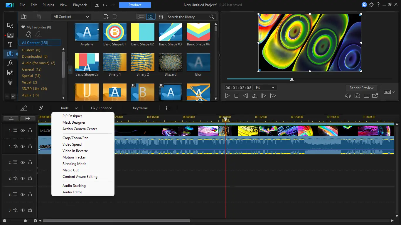 После запуска программы пользователь может импортировать медиафайлы с камер, дисков или мобильных устройств. Редактирование осуществляется на временной шкале с возможностью настройки ключевых кадров, применения эффектов и коррекции стабилизации. Функция Magic Movie позволяет автоматически создавать фильмы по заданным шаблонам, а инструменты PiP и Motion Tracking открывают возможности для сложных композиций. Экспорт осуществляется в один из множества поддерживаемых форматов, включая YouTube, Facebook и устройства Apple.