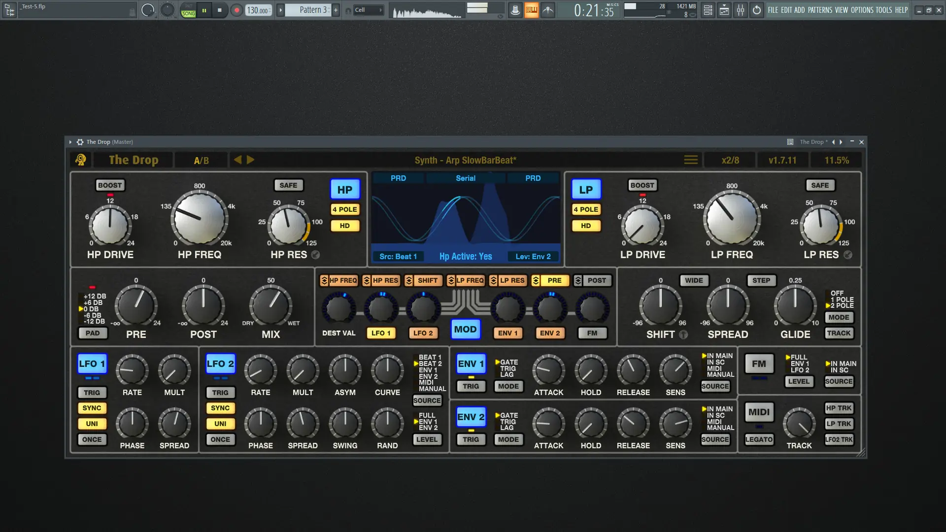- Два LFO — один базовый, второй с функцией ступенчатого секвенсора для модуляции параметров