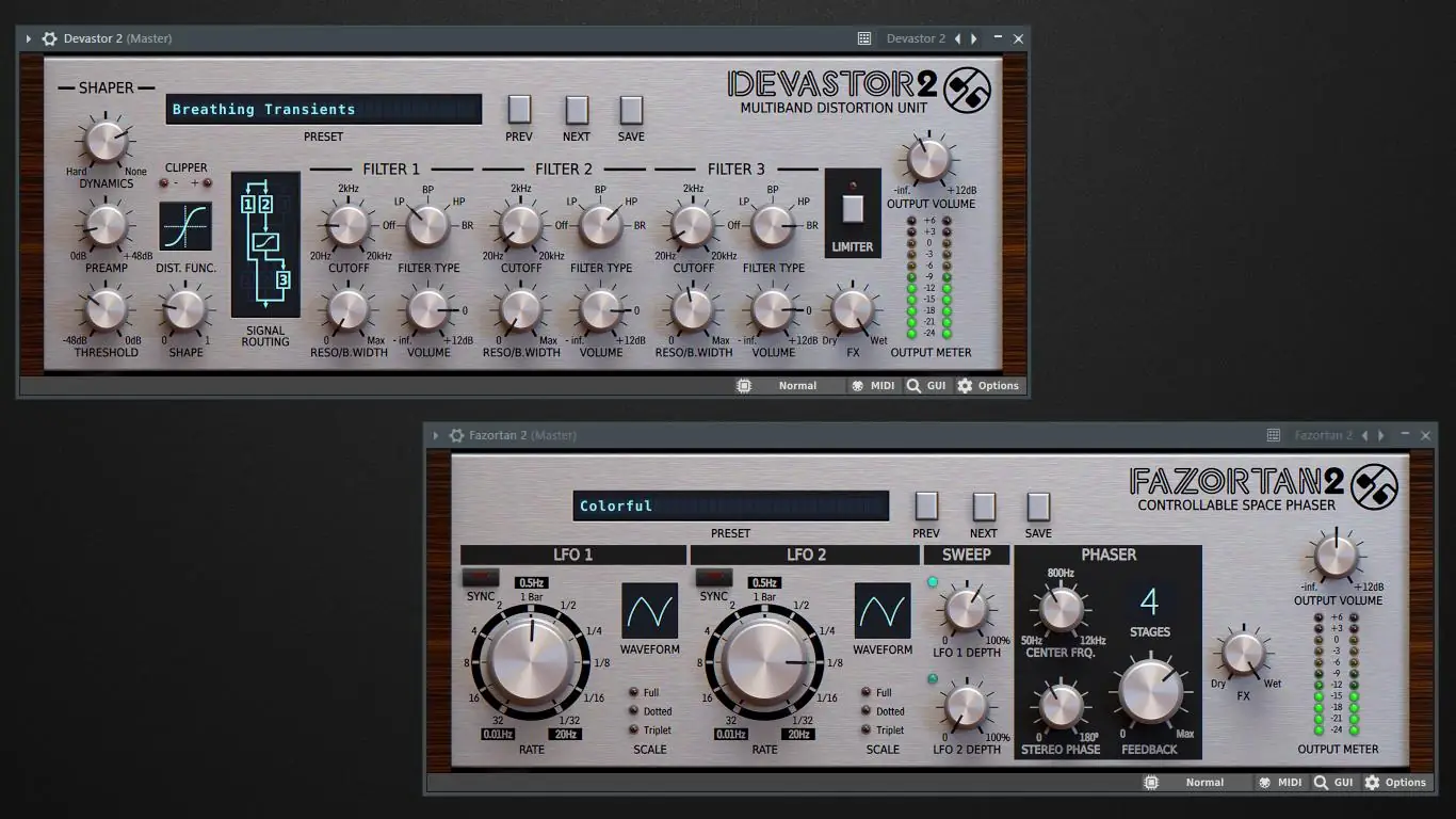 - Devastor предлагает многополосное искажение с фильтрами, аналогичными тем, что применяются в аналоговых синтезаторах.
