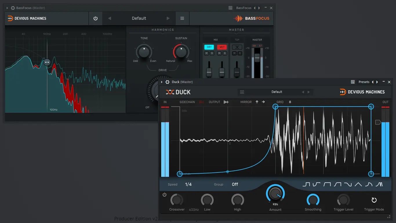 Полный набор аудиоплагинов Devious Machines включает в себя мощные инструменты для обработки звука: Bass Focus, Duck, Infiltrator, Multiband, Pitch Monster и Texture. Каждый из них решает специфические задачи в работе со звуком — от динамической обработки до радикального искажения и синтеза. Набор подходит как для микширования, так и для экспериментального звукового дизайна.