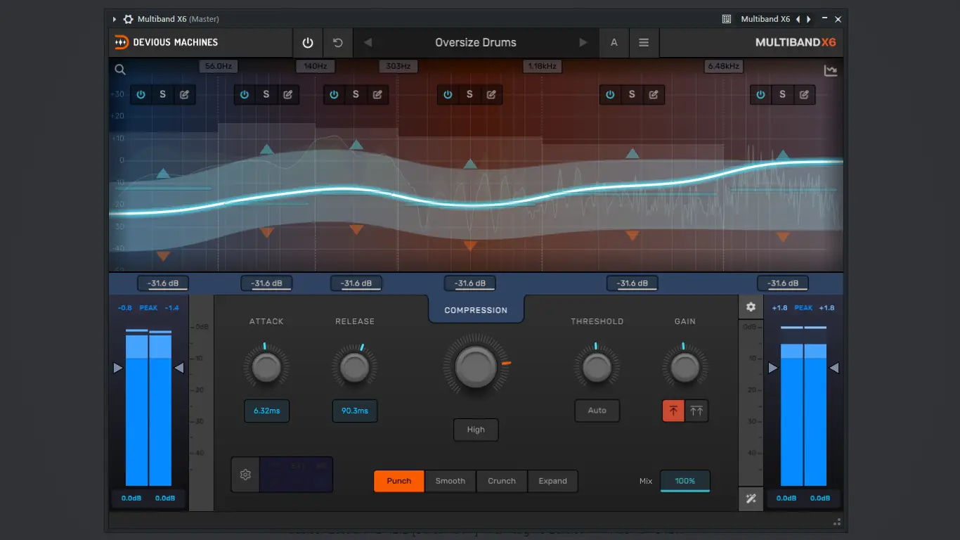 - Многополосный компрессор Multiband X6 упрощает балансировку частотных диапазонов с макроуправлением и автоматической настройкой порогов.