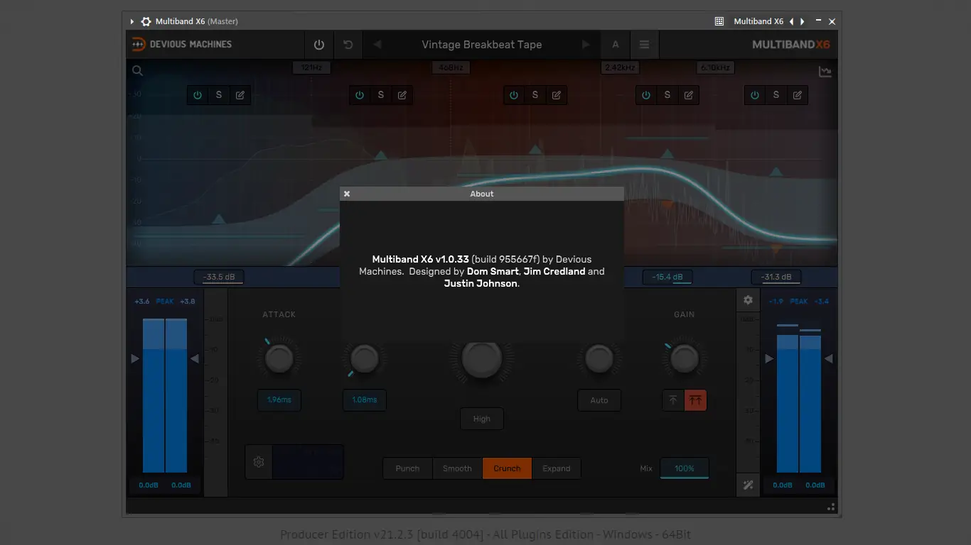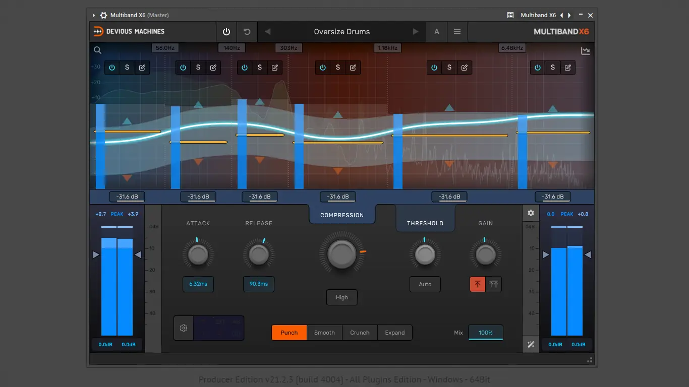 - Multiband X6 упрощает многополосную компрессию благодаря макроуправлению, автоматической настройке порогов и интеллектуальной компенсации усиления.
