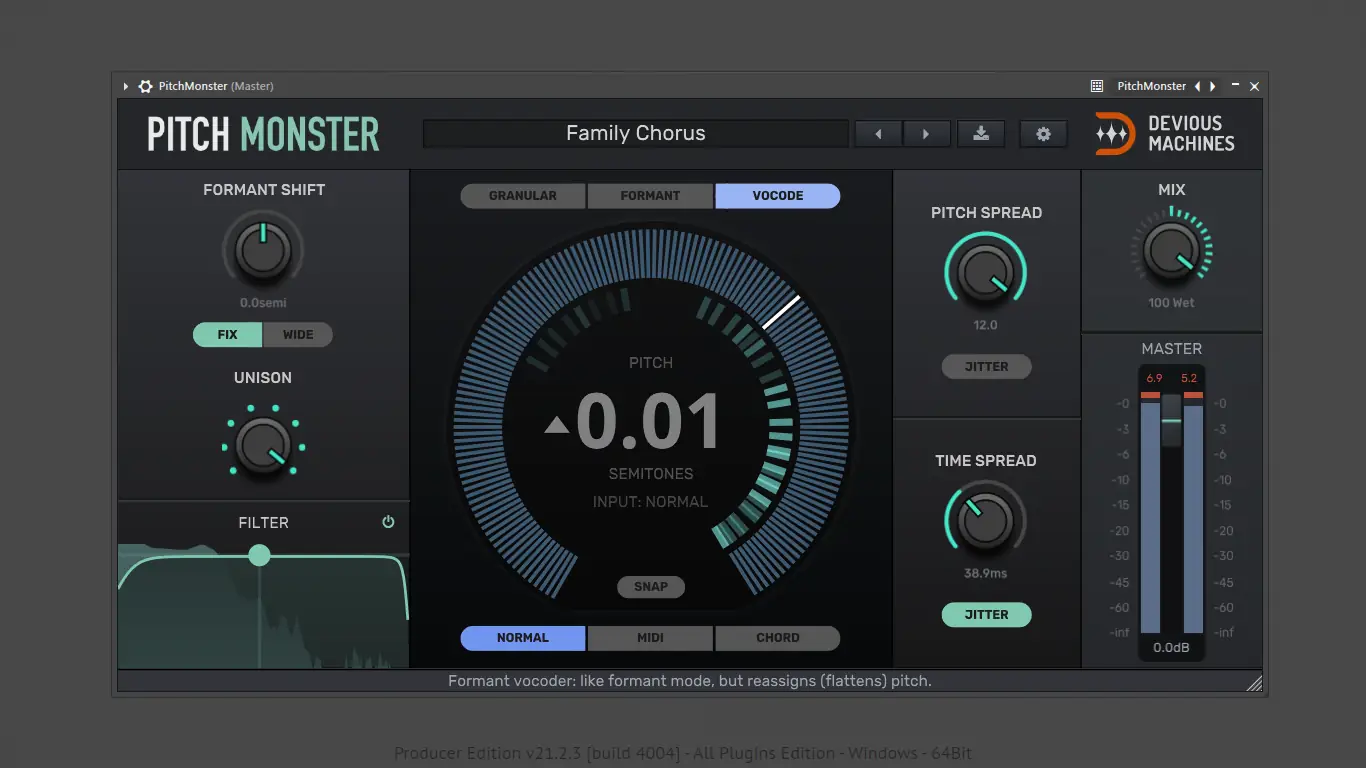 - Pitch Monster — это мощный инструмент для трансформации тона, формантных сдвигов и создания многоголосных хоровых эффектов с поддержкой полифонии и MIDI-контроля.