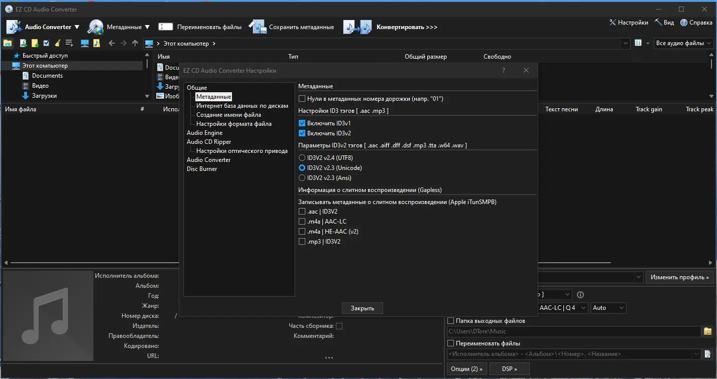 EZ CD Audio Converter — многофункциональный инструмент для копирования, конвертации и записи аудиоданных с поддержкой широкого спектра форматов, включая CD-DA, FLAC, MP3, AAC, WMA, Ogg Vorbis и других. Программа обеспечивает высокую точность извлечения аудио с компакт-дисков, работает с повреждёнными и защищёнными носителями, поддерживает загрузку метаданных из базы freedb и редактирование тегов. Подходит как для новичков, так и для профессионалов, ценящих качество и скорость обработки звука.