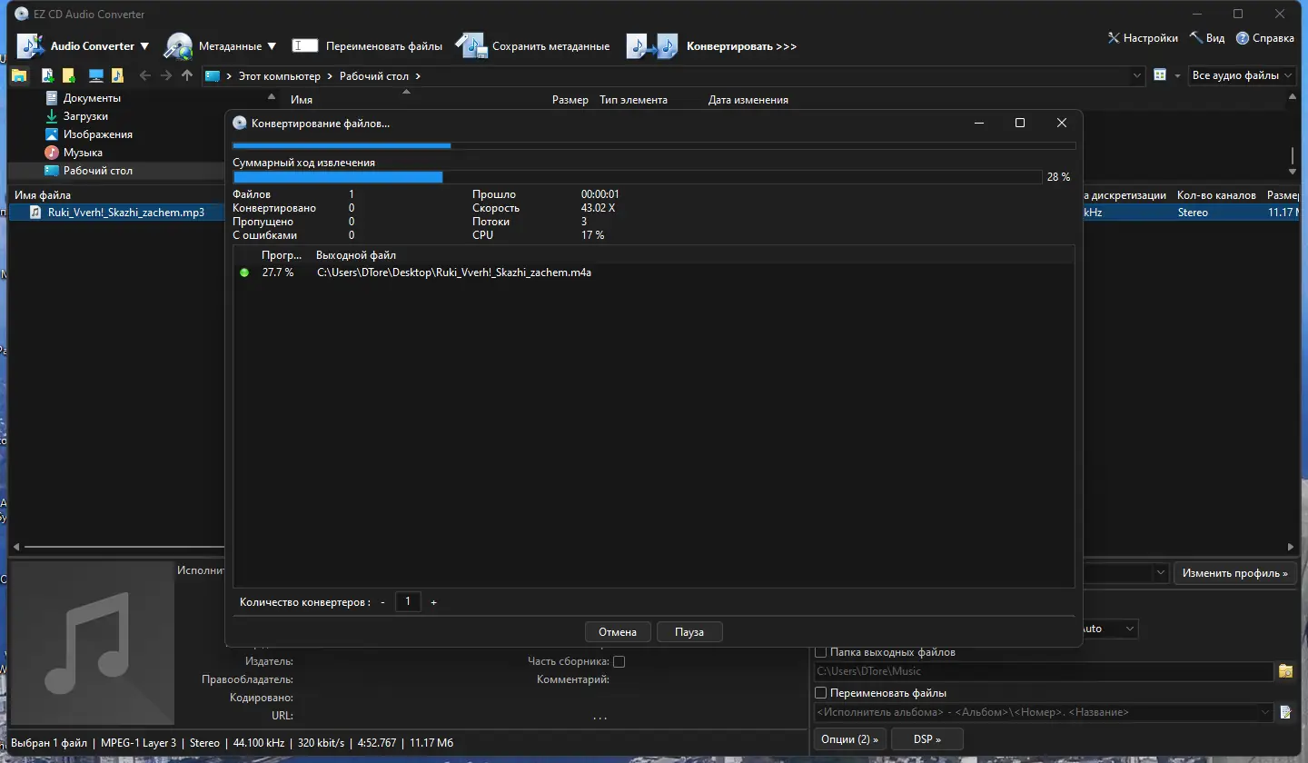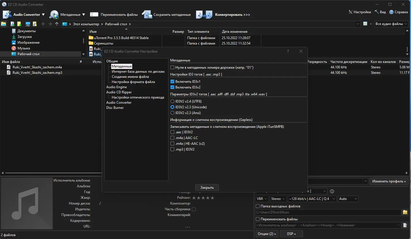 - Преобразование между форматами с сохранением метаданных и тегов ID3
