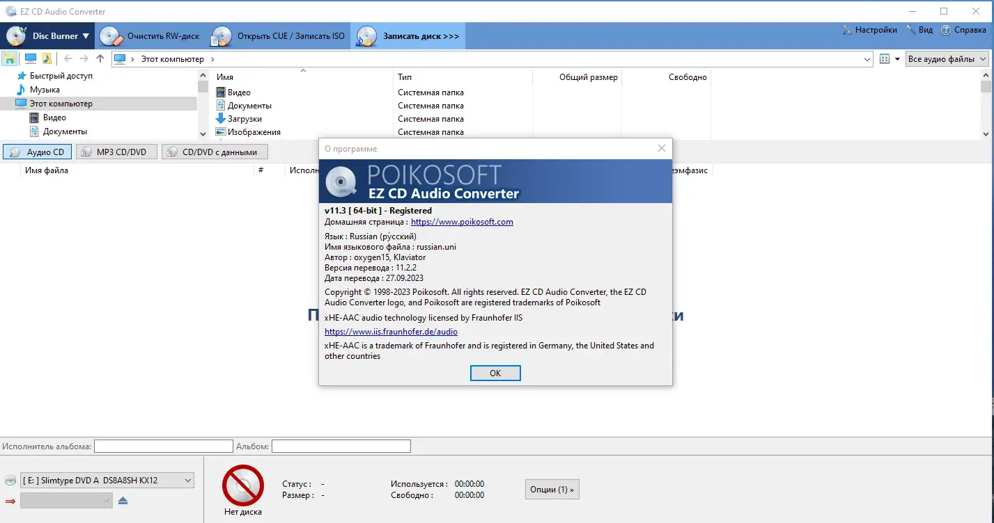 EZ CD Audio Converter — универсальная программа для высокоточного извлечения аудио с компакт-дисков и преобразования файлов между множеством форматов, включая MP3, FLAC, WAV, AAC, WMA, Ogg Vorbis и другие. Утилита поддерживает работу с защищёнными и повреждёнными дисками, обеспечивая стабильное копирование даже при неидеальных условиях чтения. Инструмент обладает продвинутыми возможностями обработки звука, такими как нормализация громкости, удаление пауз и редактирование метаданных.