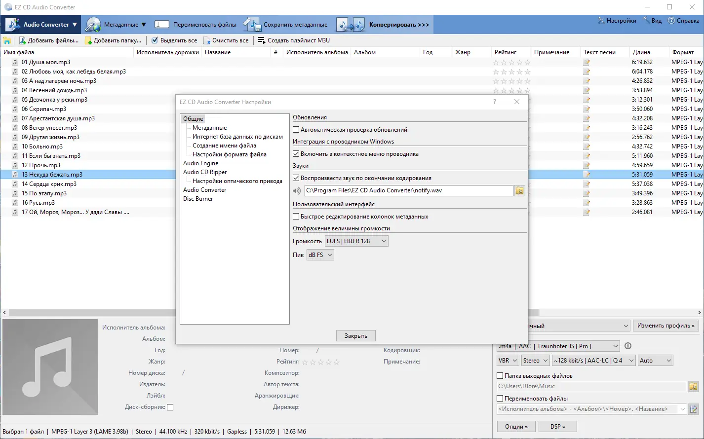 Интерфейс EZ CD Audio Converter организован в виде вкладок, что упрощает переключение между режимами: извлечение с CD, конвертация, редактирование тегов и запись дисков. Для начала работы достаточно вставить аудио-CD, после чего программа автоматически определит содержимое и подтянет информацию из базы Freedb. Пользователь может выбрать целевой формат, задать битрейт, настроить нормализацию громкости, удалить паузы между треками и указать папку для сохранения. Пакетная обработка позволяет одновременно конвертировать несколько файлов, экономя время. Для опытных пользователей доступны тонкие настройки кодеков, включая LAME MP3 и FhG FDK AAC.