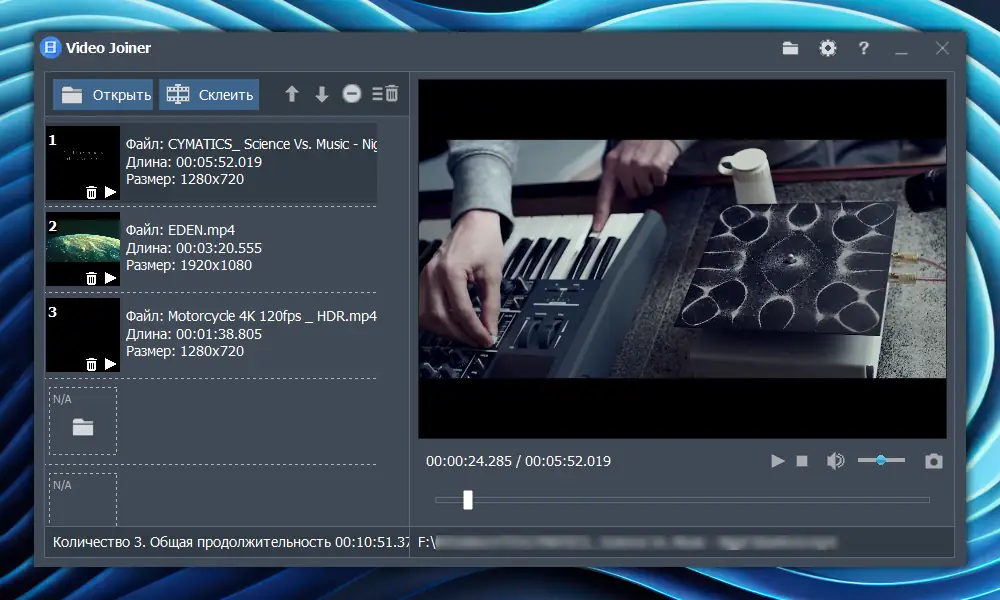 - Объединение неограниченного количества файлов в единый видеоролик.
