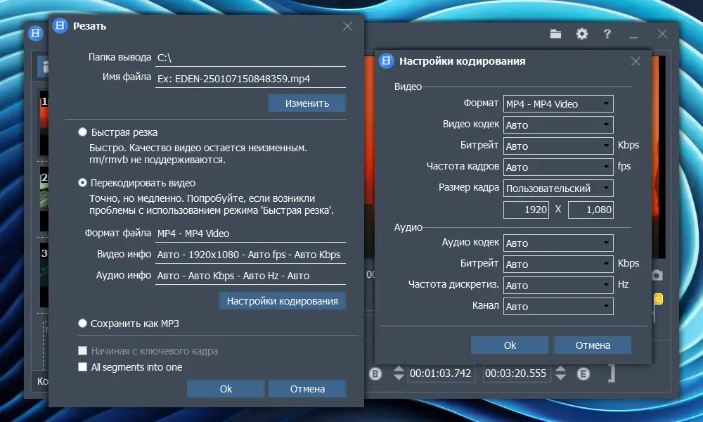 - Возможность вырезать несколько фрагментов из одного видео за одну операцию.