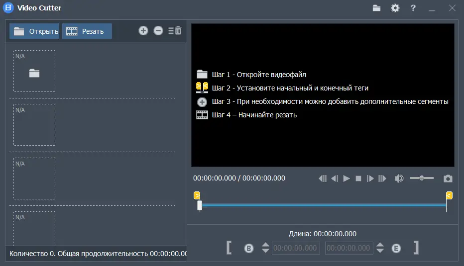 - Позволяет вырезать несколько фрагментов из видео одновременно, задавая начальные и конечные точки с точностью до миллисекунды.