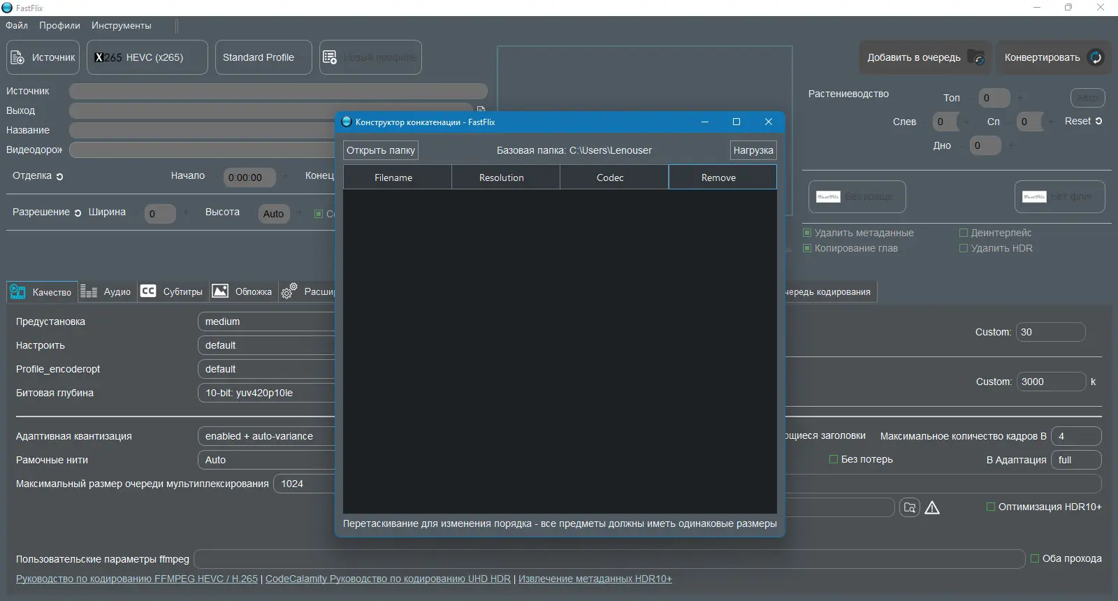 FastFlix представляет собой графическую оболочку, упрощающую взаимодействие с FFmpeg — одним из самых мощных инструментов для обработки мультимедиа. Приложение позволяет конвертировать видео в различные форматы, сохраняя при этом ключевые параметры, включая HDR-метаданные. Оно поддерживает кодеки x265, NVEncC HEVC и VCEEncC HEVC, обеспечивая высокое качество сжатия без потерь в детализации.