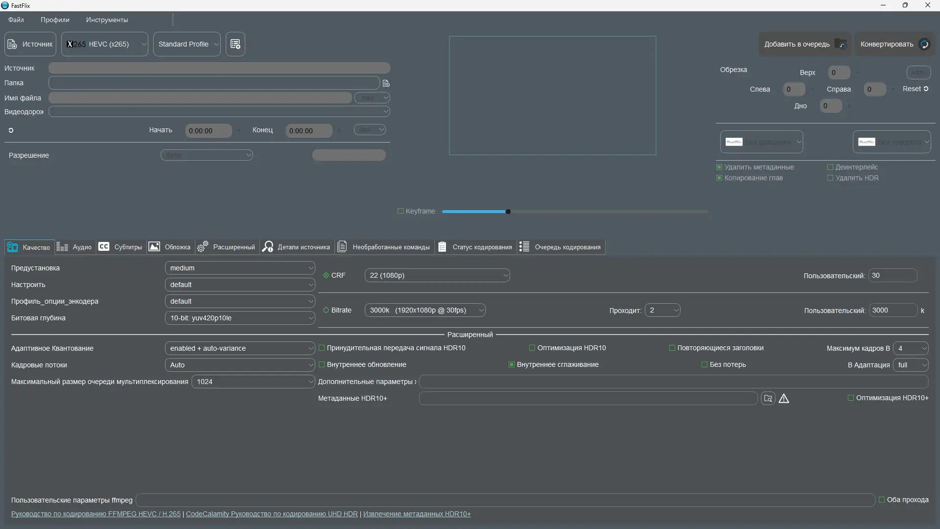 - Гибкая настройка битрейта, CRF, частоты кадров и битовой глубины