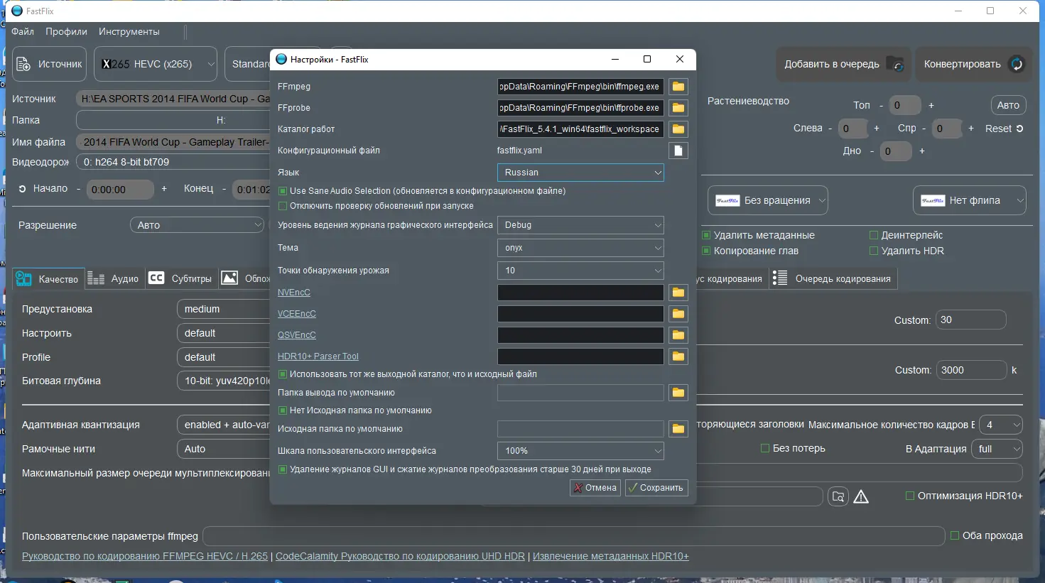 - Поддержка HDR10 при кодировании с использованием x265 и аппаратных кодировщиков от NVIDIA и AMD
