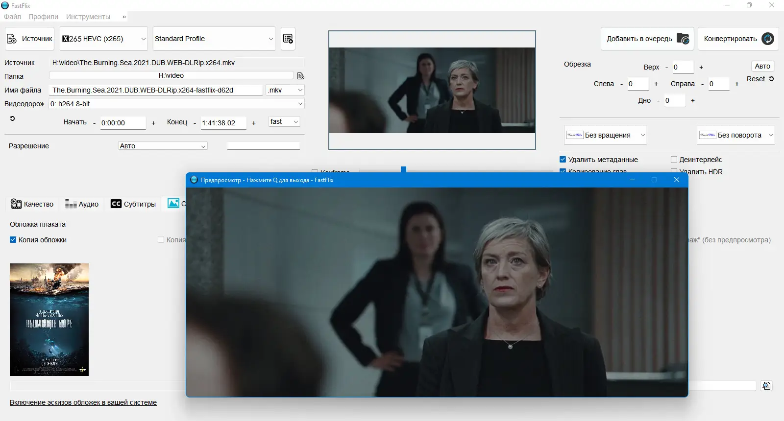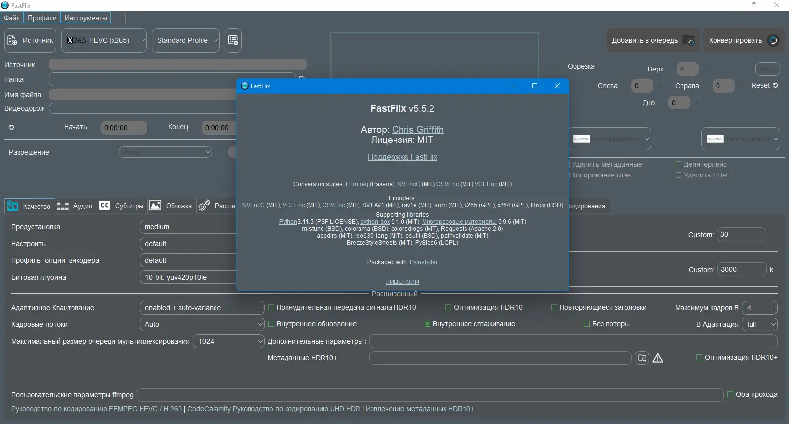 FastFlix — это удобный инструмент для перекодирования видео с поддержкой современных форматов и сохранением метаданных HDR10. Программа работает на базе FFmpeg и предоставляет доступ к широкому спектру настроек кодирования через интуитивно понятный интерфейс. Подходит как для новичков, так и для пользователей с опытом, позволяя точно контролировать параметры видео и аудио.