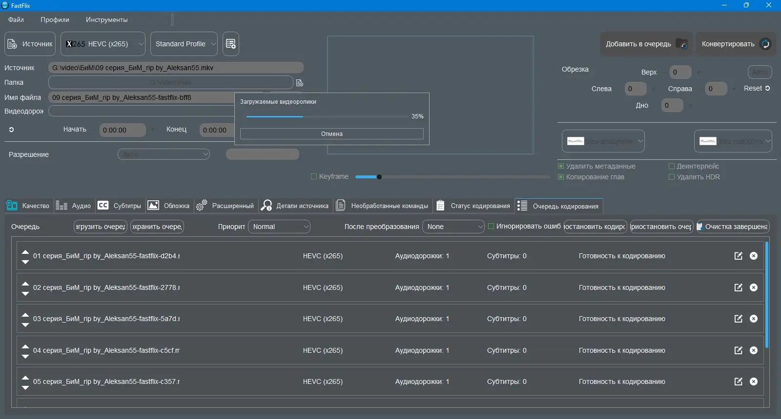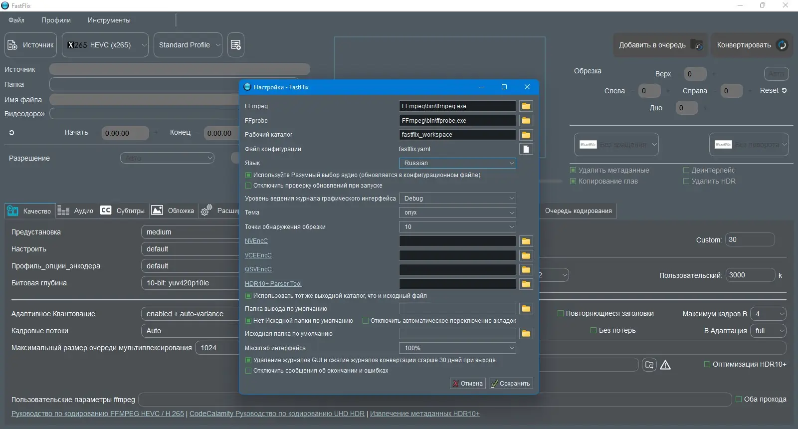 FastFlix создан для упрощения процесса перекодирования видео с использованием надежных и производительных кодировщиков. Основой работы приложения является FFmpeg, требующий версии 4.3 или выше, который автоматически загружается при первом запуске, если отсутствует. Это позволяет программе поддерживать широкий спектр форматов и кодеков, включая x265, NVEncC HEVC и VCEEncC HEVC, с сохранением метаданных HDR10, что особенно важно при работе с высококачественным контентом. В будущем поддержка будет расширена за счёт интеграции библиотек AV1, что сделает инструмент ещё более универсальным.