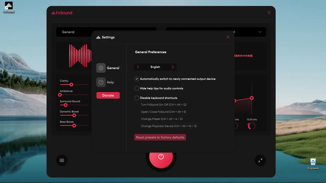 Использование FxSound не требует специальных знаний. После установки программа запускается автоматически и начинает работать в фоне. Пользователю доступен выбор предустановленных профилей — «Музыка», «Фильмы», «Игры» или «Стриминг», каждый из которых оптимизирован под определённый тип аудио. Для более точного контроля предусмотрена ручная настройка эквалайзера, включая регулировку низких, средних и высоких частот, а также активацию эффектов объёмного звучания и увеличения громкости без потерь в качестве. Анализатор спектра помогает визуально оценить текущую нагрузку на частоты и скорректировать параметры в соответствии с предпочтениями.