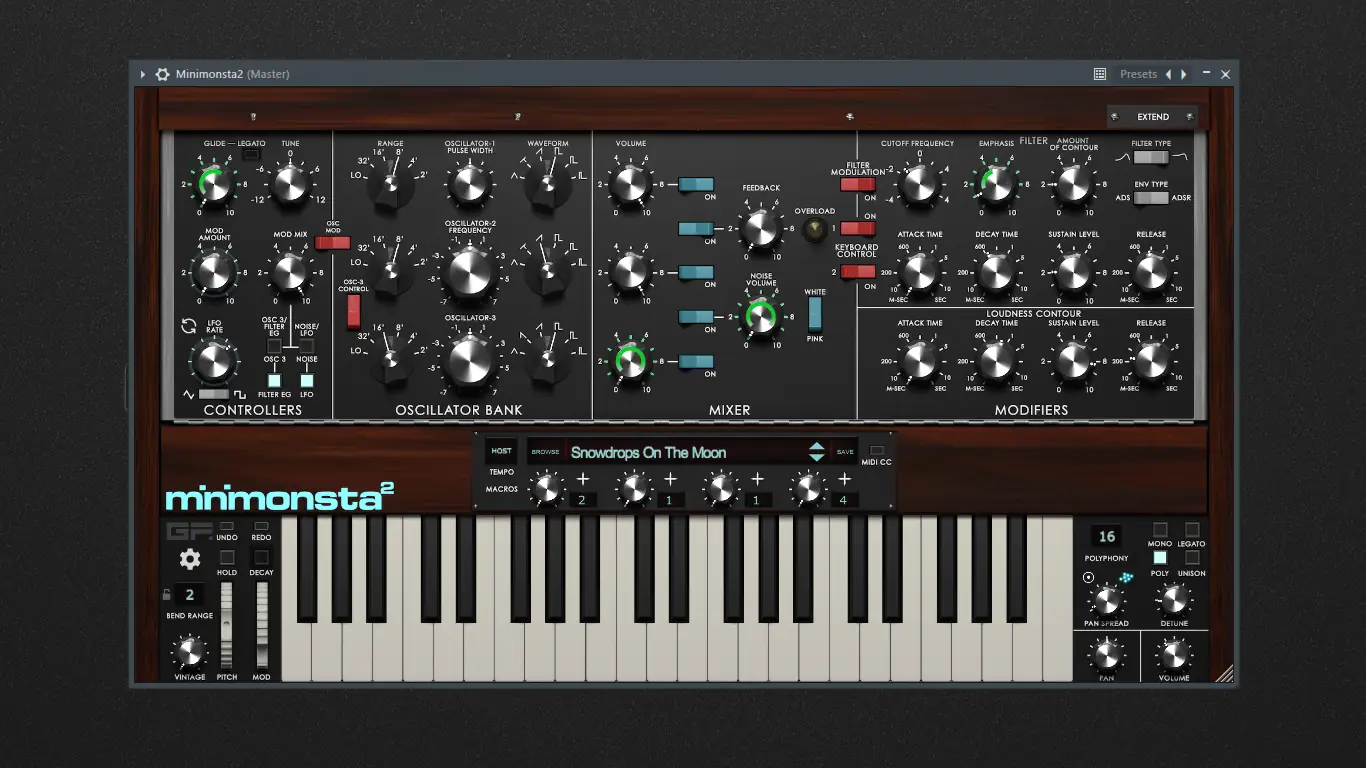 Minimonsta2 — это эволюция культового синтезатора, сочетающая точную имитацию легендарного аналогового звучания с современными возможностями цифровой обработки. Программа предлагает расширенную архитектуру, улучшенный движок и более 300 новых пресетов, открывая музыкантам доступ к насыщенным басам, плавным огибающим и сложным модуляциям. Идеально подходит для создания электронной, атмосферной и экспериментальной музыки.