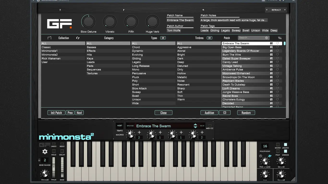 Minimonsta2 сохраняет основу оригинального синтезатора, но значительно расширяет его функциональность за счёт усовершенствованного звукового ядра и новых инструментов управления. Архитектура инструмента построена на точной цифровой эмуляции аналоговой схемотехники, что позволяет добиваться тёплого, живого звучания. Каждый элемент интерфейса оптимизирован для удобной и быстрой настройки параметров в реальном времени.