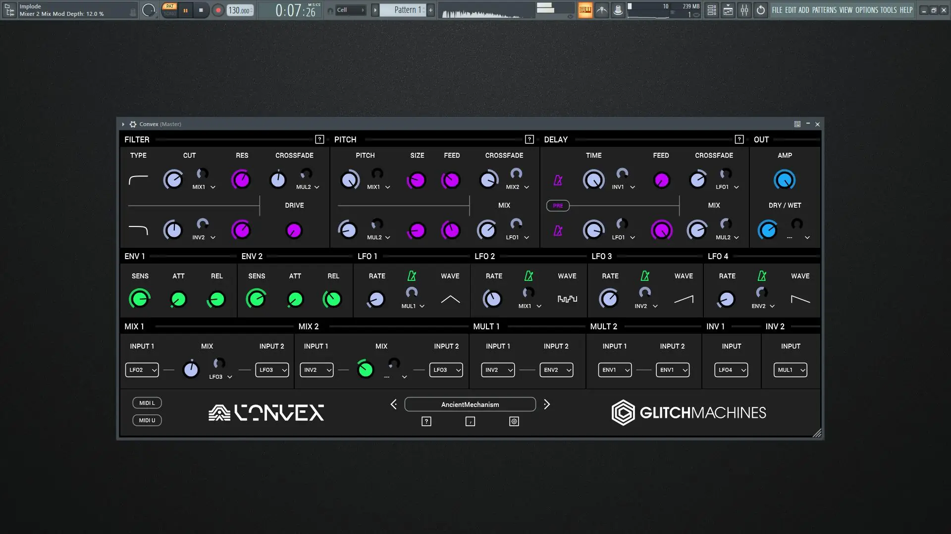 Convex построен на архитектуре парных эффектов: каждый из основных процессов представлен в двух экземплярах — фильтр, задержка и шифтер высоты тона. Такой подход позволяет плавно морфить между настройками, создавая живые, эволюционирующие звуковые последовательности. Переключение между экземплярами и кросс-фейдинг обеспечивают плавность переходов и исключительную выразительность при обработке как синтезированных, так и записанных звуков. Архитектура модульной модуляции делает возможным тонкую настройку поведения каждого параметра во времени.