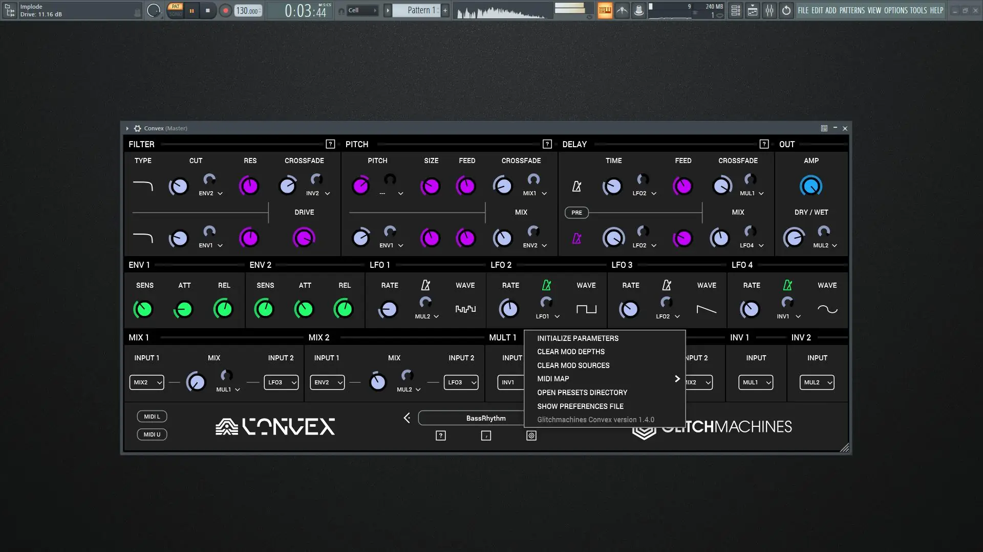 Использование Convex начинается с загрузки плагина в DAW в формате VST, AU или AAX. После подключения входного сигнала можно настроить параметры фильтров, задержек и пич-шифтеров в двух каналах, а затем активировать модуляторы для оживления звука. Каждый LFO или последователь огибающей может быть назначен на нужный параметр через меню источника модуляции с регулировкой глубины воздействия. Для создания ритмичных артефактов особенно эффективна синхронизация LFO с темпом проекта. Внешние аудиосигналы можно обрабатывать в реальном времени, что расширяет возможности при живом выступлении или импровизации.