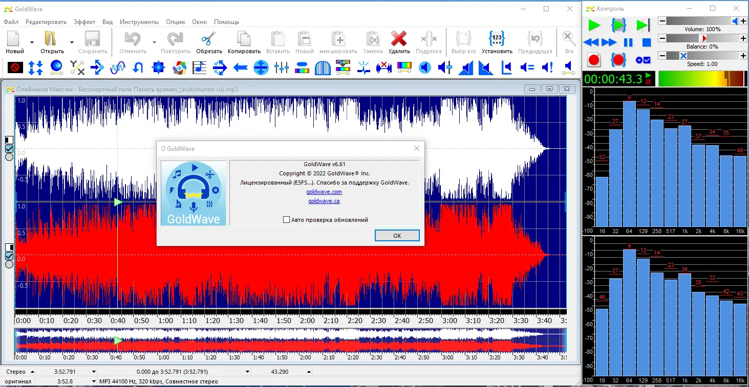 GoldWave — это мощный audio editor, предназначенный для профессиональной обработки звука, включая воспроизведение, редактирование, конвертацию и анализ аудиофайлов. Программа поддерживает широкий спектр форматов, включая MP3, WAV, OGG и AIFF, и позволяет работать с файлами объёмом более 4 Гб. Благодаря высокой производительности и набору инструментов для устранения шумов, настройки эквалайзера и применения эффектов, GoldWave подходит как для новичков, так и для опытных пользователей.