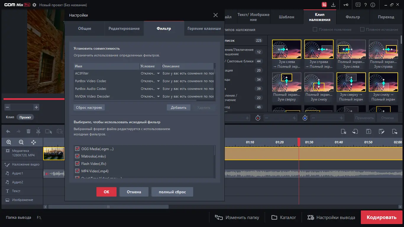 - Поддержка более 40 видеоформатов, включая популярные MP4, AVI, MKV и MOV, а также редкие форматы, такие как GOM и WebM.