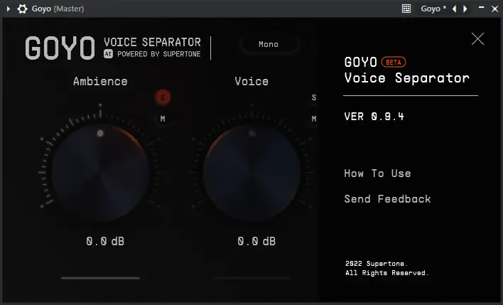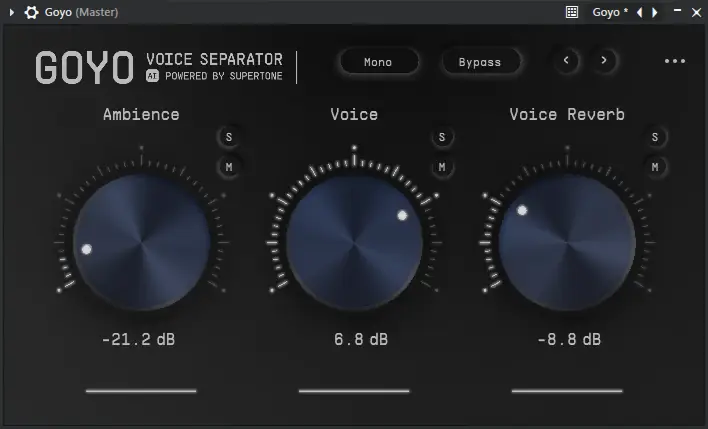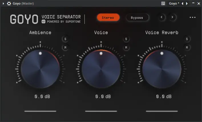 GOYO представляет собой инновационный аудиообрабатывающий инструмент, разработанный по принципу разделения сигнала на три составляющие: фоновую обстановку, голос и реверберацию. Благодаря такому подходу пользователь получает полный контроль над каждым элементом звуковой дорожки. Это позволяет гибко настраивать параметры в зависимости от условий записи и требований к финальному результату.