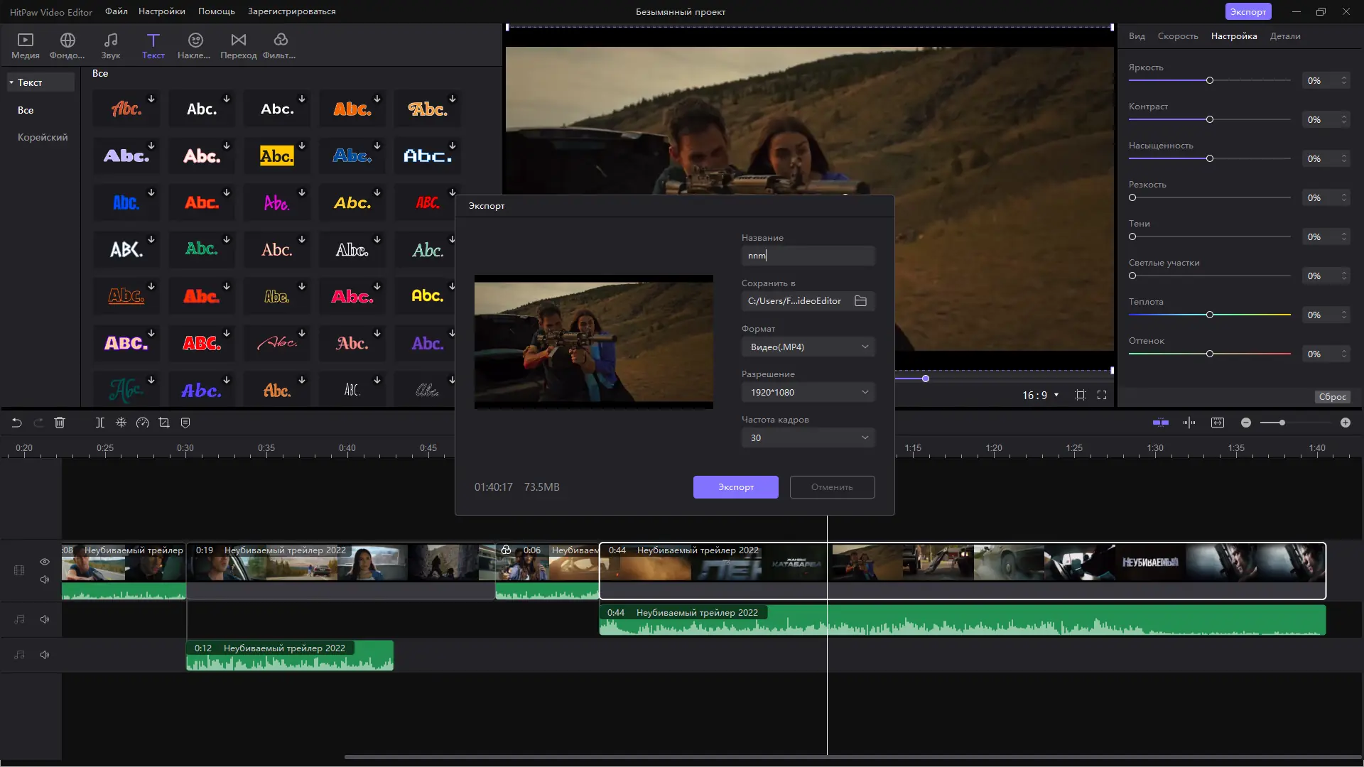 Работа с программой начинается с импорта медиафайлов в проект, после чего их можно свободно размещать на многодорожечном монтажном столе. Каждый клип поддаётся редактированию: его можно обрезать, изменить скорость воспроизведения, отразить зеркально или наложить эффект затухания. Добавление текста сопровождается возможностью выбора шрифта, цвета, анимации и позиции на экране, что делает титры выразительными и гармоничными.
