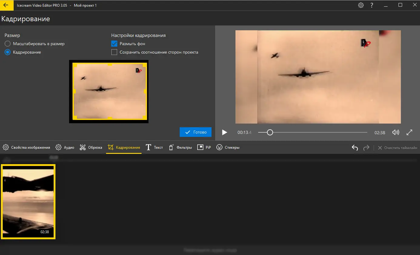 - Возможность экспорта видео в нужном соотношении сторон — альбомном, портретном или квадратном (1:1)