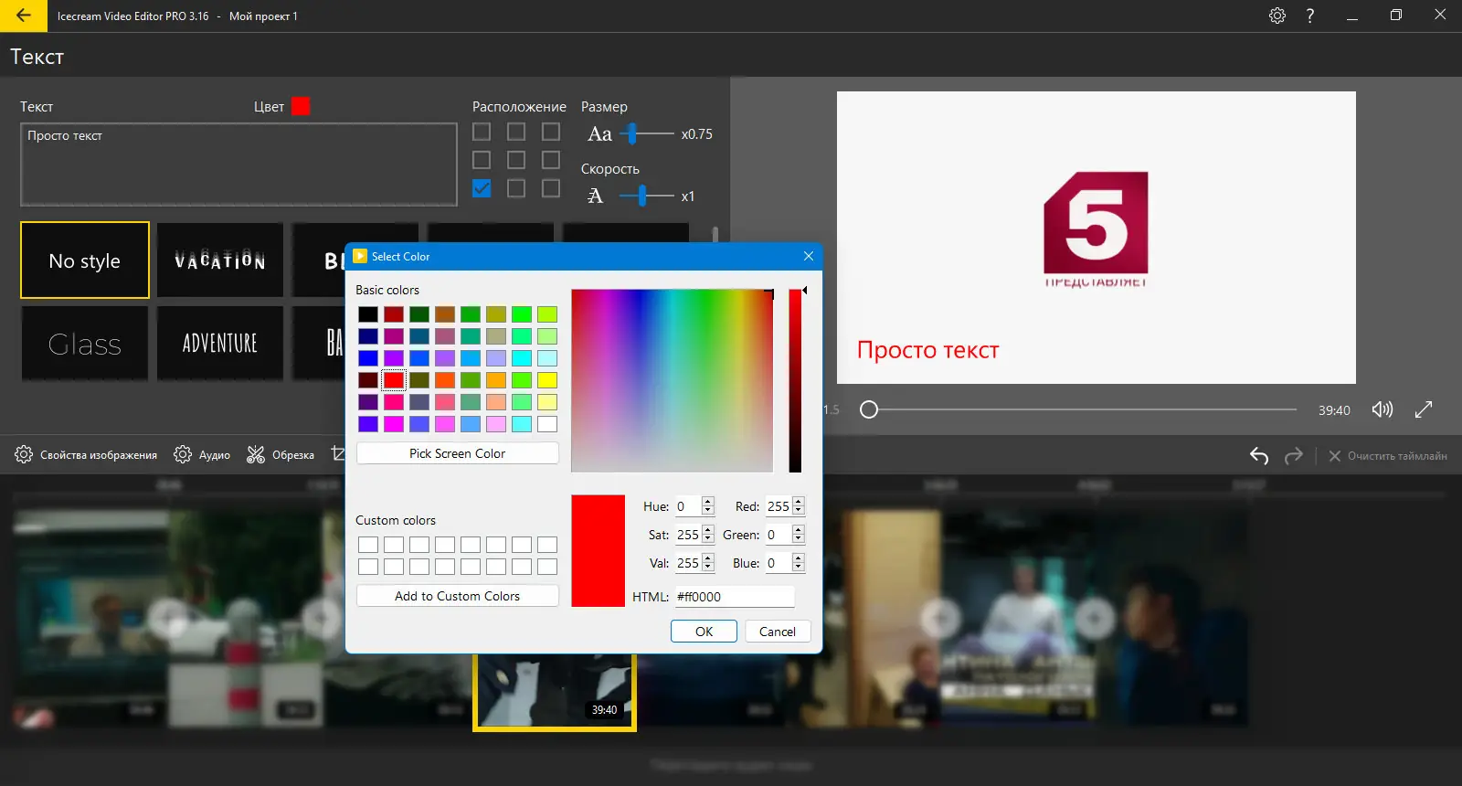 - Широкие возможности редактирования: обрезка, кадрирование, эффекты, текст, аудио, регулировка параметров изображения.