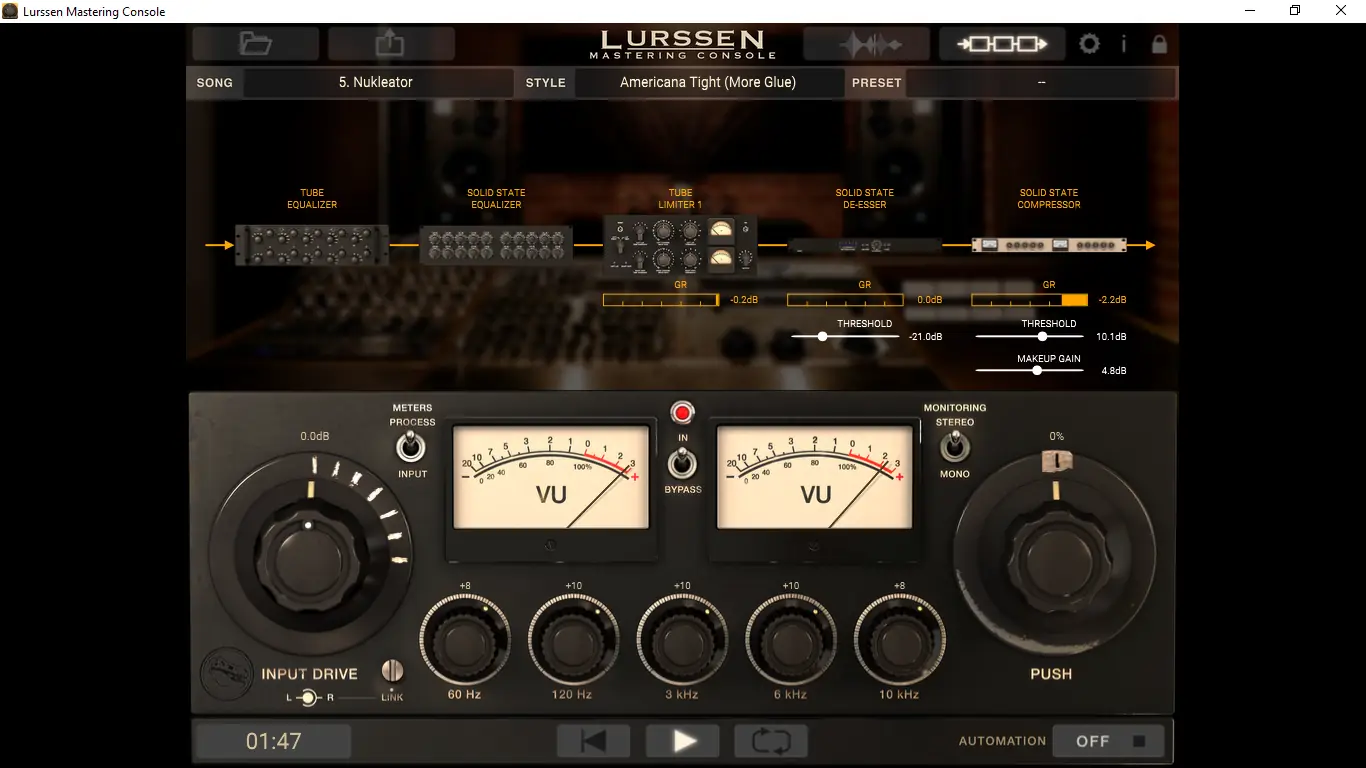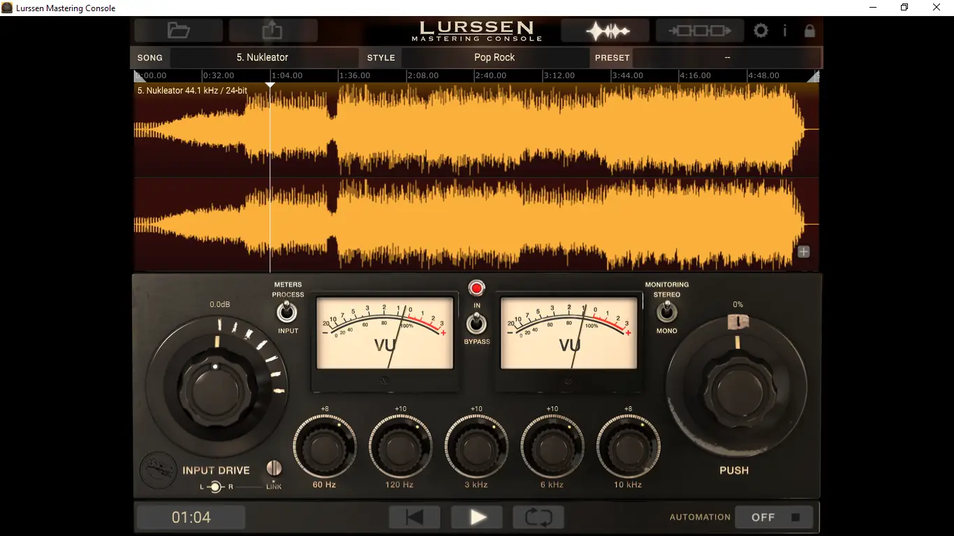 Интерфейс программы интуитивно понятен и ориентирован на быстрый результат. После загрузки аудиофайла пользователь выбирает один из 30 предустановленных стилей, адаптированных под определённые жанры. Каждый стиль содержит настроенные параметры всех процессоров в цепи, включая эквалайзер, компрессию и лимитирование. Далее доступны три основных регулятора: Input Drive, пятиполосный эквалайзер и ручка PUSH, которая тонко усиливает звуковую картину. Режим автоматизации позволяет записывать движения ручек в реальном времени, а переключатель bypass помогает сравнивать результат с исходником. Дополнительно присутствует возможность мониторинга в моно для проверки совместимости.