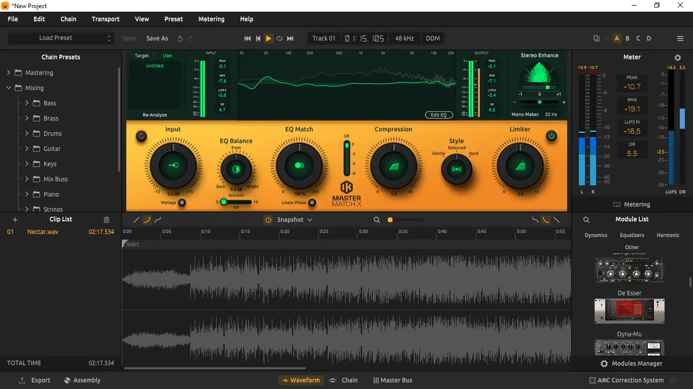 - Новые модули, такие как Master Match X, позволяют автоматически анализировать референсные треки и подстраивать параметры эквализации и динамики под заданный эталон.
