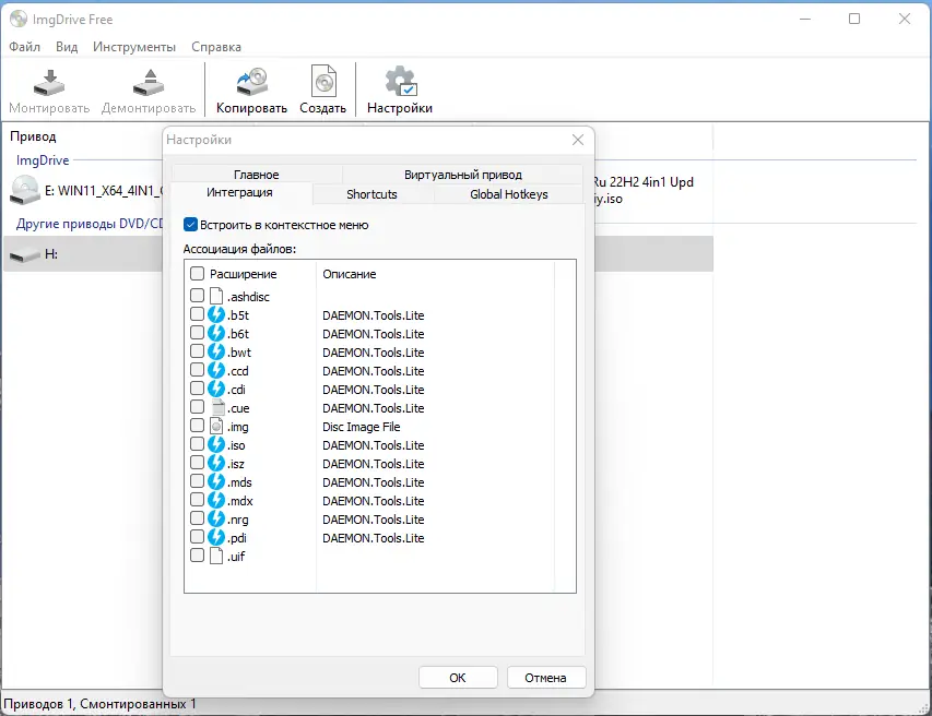 ImgDrive — это легковесный и стабильный эмулятор виртуальных дисководов, позволяющий быстро монтировать образы различных форматов без необходимости использования физических носителей. Программа поддерживает широкий спектр форматов, включая ISO, CUE, NRG, MDS/MDF, CCD, ISZ и аудиофайлы, такие как APE, FLAC, WAV. Интеграция в контекстное меню Windows и работа из системного трея делают процесс открытия образов максимально удобным и быстрым.
