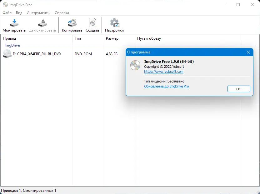 ImgDrive не требует перезагрузки системы после установки и совместим с 32- и 64-битными версиями Windows от XP до Windows 11.