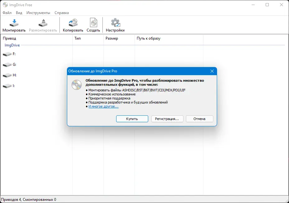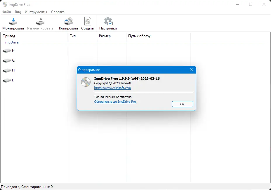 ImgDrive совместим с системами от Windows XP до Windows 11 и поддерживает как 32-, так и 64-битные архитектуры.