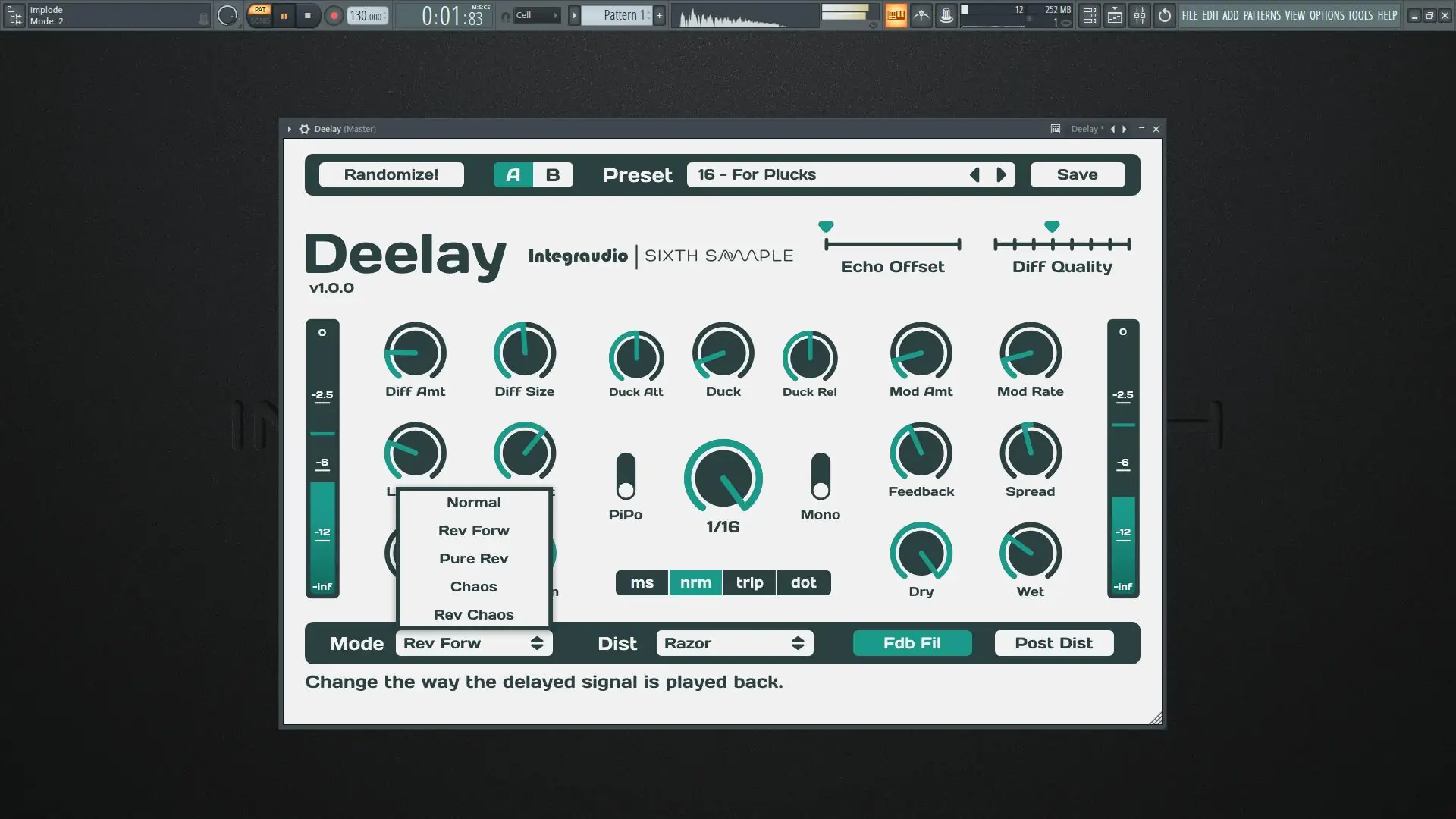 Integraudio — Deelay — бесплатный аудиоплагин задержки с минималистичным интерфейсом и широкими возможностями обработки звука. Включает пять режимов задержки, эффекты диффузии, искажения, модуляции и фильтрации. Подходит для создания реверберации, текстурированных слоёв и динамических звуковых переходов в музыкальных проектах.
