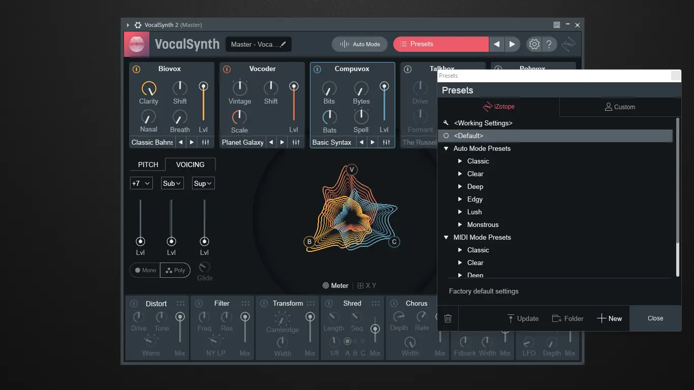 Вокальный процессор iZotope VocalSynth 2 — это мощный инструмент для творческой обработки вокала, объединяющий пять уникальных модулей и передовые технологии моделирования голоса. Программа позволяет создавать как натуральные вокальные гармонии, так и экспериментальные электронные эффекты, идеально подходя для современных студийных решений. Плагин интегрируется в экосистему iZotope и совместим со всеми популярными DAW.