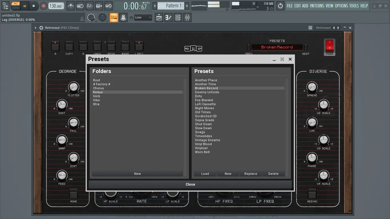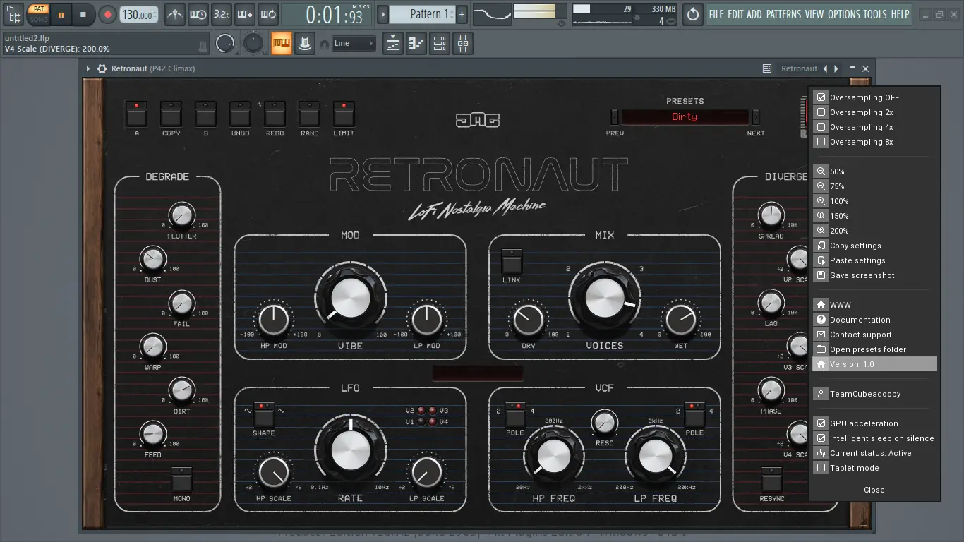 Использование Retronaut начинается с выбора количества активных голосов вибрато — от одного до четырёх. Далее, с помощью фильтров в секции VCF, можно вырезать лишние частоты или, наоборот, подчеркнуть определённые диапазоны. Резонанс, общий для НЧ и ВЧ фильтров, позволяет добавить выразительности, особенно при модуляции через параметр Vibe. Блок Degrade активируется по мере необходимости: Flutter добавляет хаотичности в модуляцию, Dust и Fail вносят шум и импульсные провалы, имитируя износ кассеты. Параметры Dirt и Feed создают насыщение и взаимодействие между голосами, усиливая эффект старения. Секция Diverge даёт контроль над фазами и задержками, позволяя каждому голосу вести себя по-разному — это создаёт живое, неповторимое звучание.