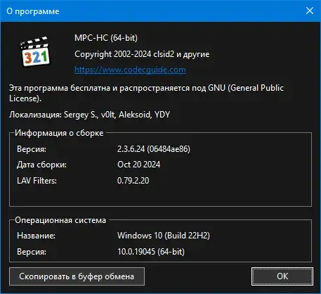 - Содержит Media Player Classic Home Cinema — легковесный, но функциональный проигрыватель, оптимизированный для работы с пакетом.